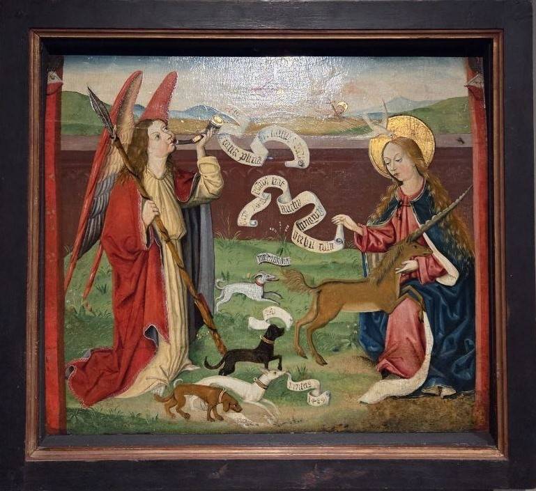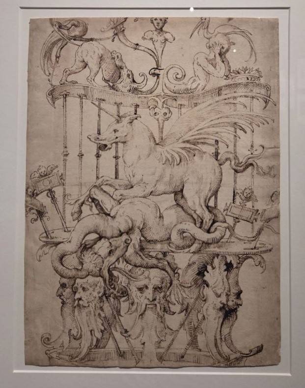 Среди экспонатов – уникальная работа Мартина Шонгауэра «Благовещение. Мистическая охота на единорога» (1489) В роли охотника выступает архангел Гавриил, а привечает единорога Дева Мария. Присутствие этого животного являет её кристальную невинность, духовную и телесную чистоту. Изумителен рисунок итальянца Джулио Кампи «Гротеск с единорогом и драконом в центре» (середина XVI в.) – тут единорог побеждает дракона посреди вычурных виньеток, каковые так нравились заказчикам эры чинквеченто. Аллегория Кампи отображает победу сил добра над огнедышащим злом.