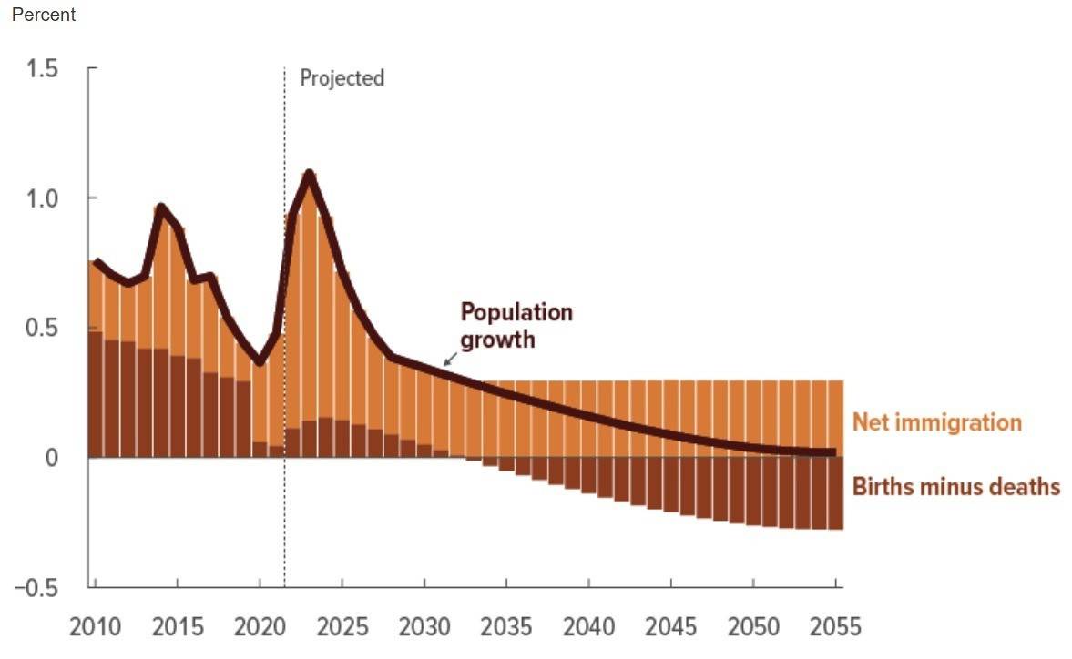 За 2006 год прирост населения составил 1,1%, наполовину за счет превышения рождаемости над смертностью и наполовину за счет притока мигрантов. В 2025 году естественный прирост населения замедляется до 0,14% (полтора человека на тысячу), а приток мигрантов сохраняется на уровне 0,57% (как в 2006 году). По прогнозу, естественный прирост обнуляется к 2033 году и становится отрицательным 0,2% в 2044 году. Уполовинивается до 0,3% прирост населения за счет мигрантов.
