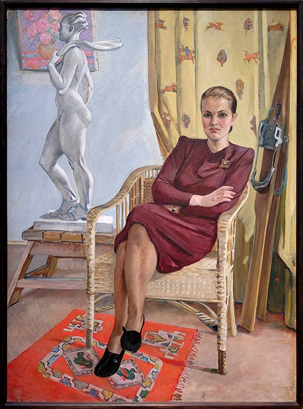 Его по-прежнему влекут красавицы. Великолепен портрет архитектора Тамары Милёхиной (1948-1949). Эффектная дама сидит в кресле, на ней модное «с плечиками» платье глубоко-бордового цвета. Рядом – скульптура обнажённой спортсменки, сделанная в 1930-х годах – надо сказать, что в искусстве 1940-1950-х практически не встречается «ню». Всё чаще мастер обращается к природе, как к источнику вдохновения. Тому примеры – «Вечер в полях. Пейзаж со стогом» (1949), «Георгины и флоксы» (1950-е гг.), «Вечер в Подрезкове» (1958).