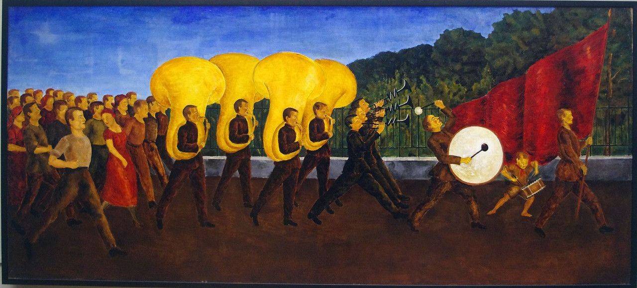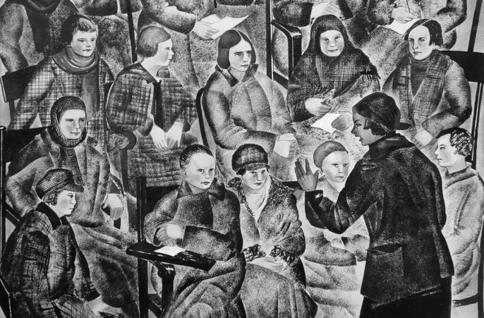 Авторы экспозиции явили всю палитру 1920-х. Вот – яростные «Трубы» Сергея Лучишкина, где стройные ряды комсомольцев маршируют в блистающее послезавтра. А тут – «Банный хвост» Александра Вахрамеева. Очередь в баню. Поистине зощенковский сюжет о том, как «помывка сознательного пролетария» сопряжена с многочисленными трудностями. Тут показаны все слои населения – и конторские барышни, и мобилизованный красноармеец, и господа «из бывших», донашивающие свои элегантные пальто. «Собрание текстильщиц» Александры Платуновой – это гимн советскому равноправию. Отныне женщина сама решает, как ей поступать – на работе, в быту и любви. СССР признал право «слабого пола» на сильные поступки. Уже не муж и не отец определял место под солнцем. На фотографиях – стирка на коммунальной кухне, обед в столовой, физзарядка в детском саду (ясли и детсады активно продвигались в массы, чтобы матери включались в трудовой процесс). Динамичное и жёсткое время! Устремлённость к новым горизонтам. На выставочных стендах – афиши фильмов «Девушка с коробкой» и «Третья Мещанская». Золотое время советских постеров, когда братья Стенберги, друзья Владимира Маяковского, обслуживали киноиндустрию.