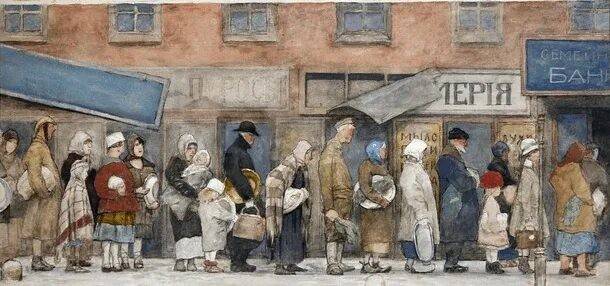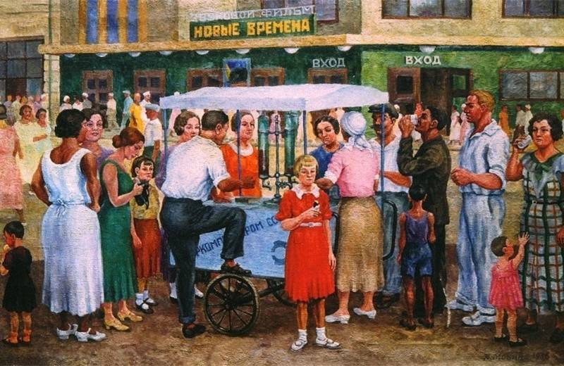Перед нами картина Александра Монина «Новые времена», созданная в середине 1930-х. Тут уже нет контрастов – ни лохмотьев, ни заграничных рединготов. Респектабельно, хотя и просто одетые люди стоят в очереди за газированным напитком, а фоном – кинотеатр с афишей ленты «Новые времена» Чарли Чаплина. Картина – символична и многослойна, несмотря на посредственность живописной техники – настали времена, когда «жить стало лучше – жить стало веселее». Так сказал Иосиф Сталин, глядя на свершения. Люди выдохнули – наступило благополучие, отразившееся в таких кинокомедиях, как «Моя любовь», «Антон Иванович сердится» и «Сердца четырёх».
