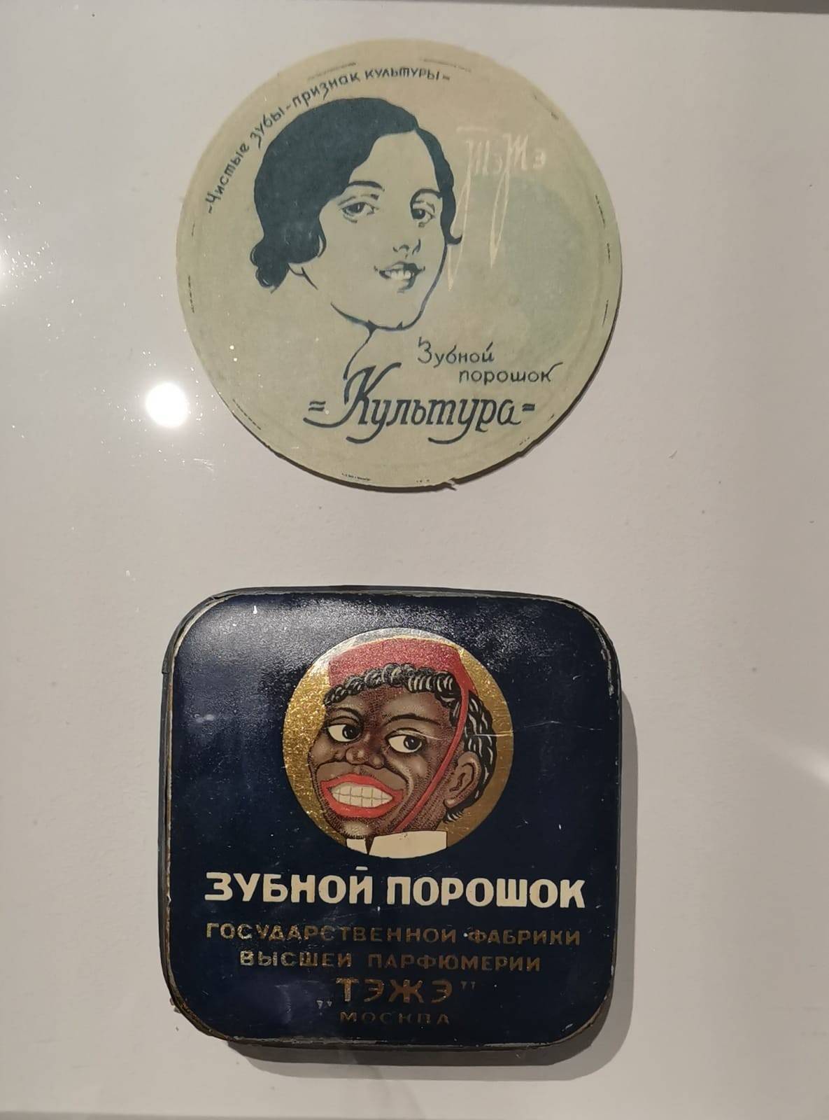 Сейчас покажется диким, но к тонкому мылу и зубному порошку надо было ещё и приучать. Большинство крестьянско-пролетарского населения обходилось еженедельной баней и самым простым мылом – без отдушек. Советская власть в лице своих культуртрегеров буквально заставляла людей мыться на постоянной основе, а не лишь раз в неделю. На производствах и в домах нового типа был обязательный душ. В детских садах воспитатели следили за тем, чтобы дети чистили зубы. В школах проверяли руки и шею. Беспризорников насильно отмывали и уже потом устраивали им путёвку в жизнь. Боролись с вшами, клопами да блохами. Неслучайно возник «Мойдодыр» Корнея Чуковского, где против мальчика-грязнули ведутся настоящие бои. Среди экспонатов – не только баночки из-под порошков и одеколонные флаконы – тут презабавная инсталляция из кусков розового мыла.