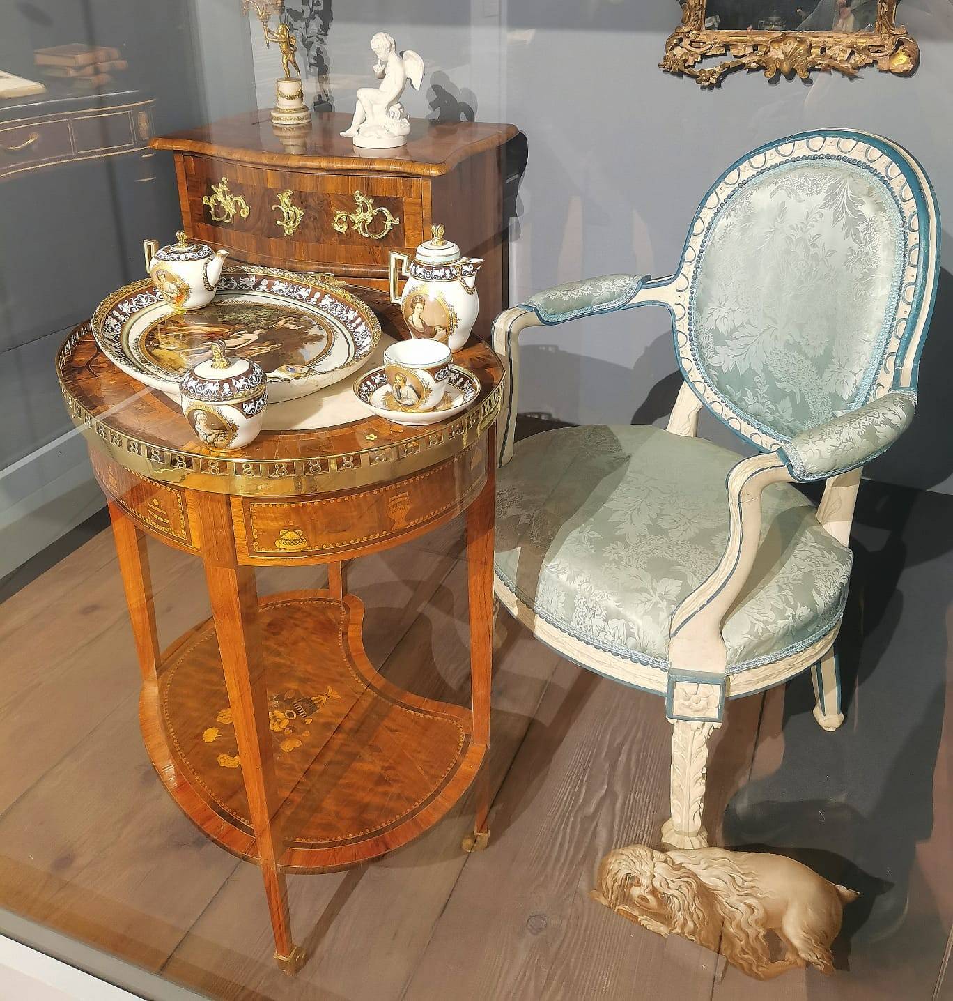 На маленьком столе горкой лежат книги – сочинения Вольтера, Сумарокова, Тассо и Шекспира, а ещё – ноты. Игра на клавесине и пение также входило в образовательный курс. Тут же стоит очаровательная чашка, привезённая из Англии. Во второй половине XVIII столетия в России, как и в остальной Европе, затеялась англомания, потому-то британские изделия охотно приобретали в тех странах, где имелось своё фарфоровое производство. Далее мы видим сервиз Мейсенской мануфактуры с росписью на сюжеты картин Ангелики Кауфман – знаменитой художницы, принятой сразу в несколько Академий.