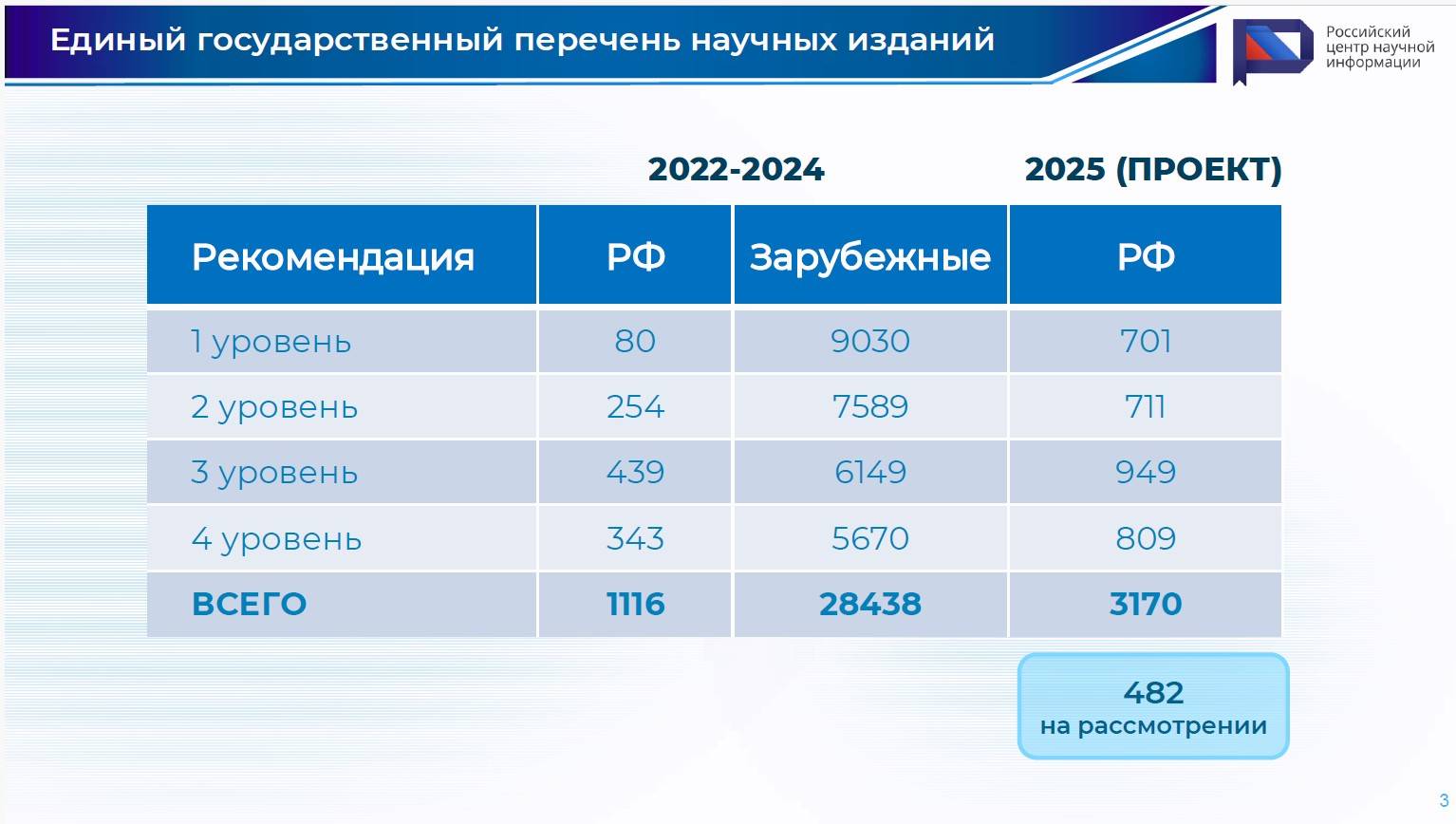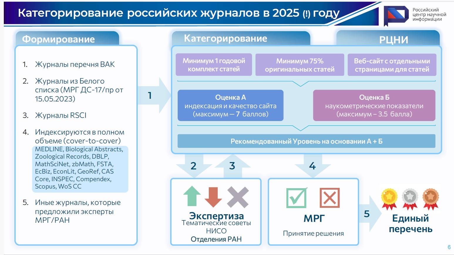 В середине сентября 2025 года утверждён Единый государственный перечень научных изданий (ЕГПНИ), который станет обязательным со следующего года и заменит «зоопарк» действующих списков-перечней. В начале следующего года также ожидаются поправки в Методику расчёта комплексного балла публикационной результативности (КБПР), которые ранжируют уровни ЕГПНИ для «копилки» университетов, институтов и ученых.