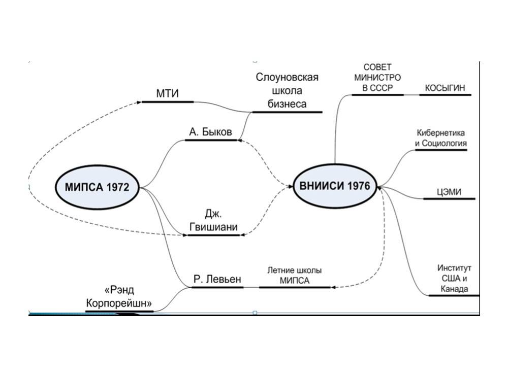 В сравнении с брежневским руководством, которое в общем и целом придерживалось традиционной евразийской ориентации, что было особенно характерно прежде всего для высшего военного руководства, ряд партийных и – шире – политических деятелей и околополитических персон в позднем СССР стали проявлять повышенный интерес к мондиализму – идейно-политическому комплексу, являющему собой полную противоположность геополитическому мышлению. И, заметим, это был отнюдь не «красный мондиализм» в духе Троцкого и К°. Увы, уже в то время в нашей стране стал пробивать себе дорогу атлантизм, с налетом именно мондиализма. Здесь, тон задавали смотревшие на Запад и внимавшие ему некоторые политики, занятые проведением внешнеторговых операций и/или курировавшие эту «доходную» госчиновники, а также обслуживавшая власть экспертная «публика» (особенно журналисты-международники). Последнюю линию, как с конца 1960-х гг. весьма активно продвигала группа Дж.М. Гвишиани (1928–2003)* – видного деятеля из числа советской парт/гос/номенклатуры, де-факто продвигавшего идею конвергенции двух систем. С конца 1960-х гг. он был одной из самых важных персон, через которую советское руководство осуществляло неформальные контакты с Западом, в частности с созданным в 1968 г. Римским клубом (не случайно весьма доверительные отношения связывали Дж.М. Гвишиани с создателем этого «мозгового треста» и его первым президентом А. Печчеи). Между прочим, задуманный и руководимый Д.М. Гвишиани НИИ системных исследований должен был по идее стать ничем иным, как филиалом МИПСА. (Но это, как говорится, предмет для особого разговора; ограничимся здесь лишь тем, что приведем схему их взаимодействия в общем контексте отношений с Западом, которые выстраивались тогда советским руководством, ряд линий которых шел как раз через группу Д.М. Гвишиани* (см. схему ниже с опорой на такой источник, как [27]).