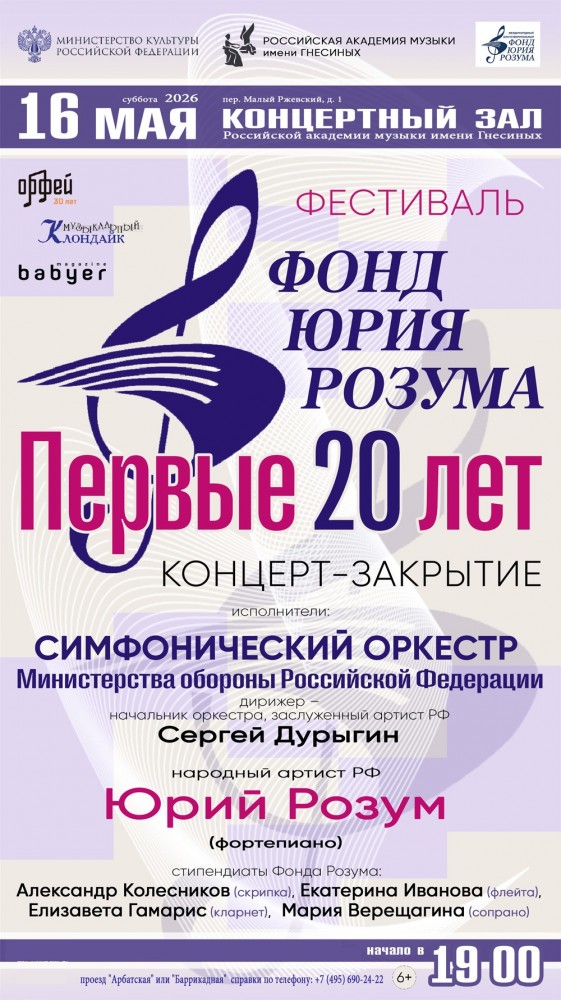 Фестиваль «Фонд Юрия Розума. Первые 20 лет» завершится Гала- концертом 16 мая в Концертном зале РАМ им. Гнесиных.
