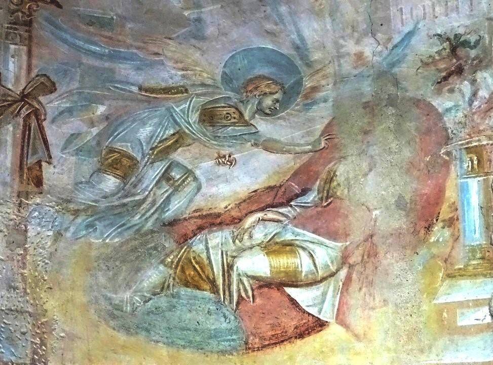 И никак не связывает эту фреску ни с «Жертвоприношением Авраама» в нартексе, ни с «Воскресением» (оно должно быть прямо напротив – на северной стене алтарной апсиды, но, к сожалению, не сохранилось) как победой Христа над Смертью – перекличка здесь совершенно очевидна, а соседство изображений подчеркивает заложенные в них смыслы, делает их особенно наглядными.