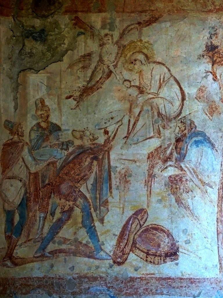 42. Полуциркульный свод. Внушительных размеров ангел и пастушок на горке. Заметим, что волхвы здесь снова в красных фригийских колпаках. И не только потому, что роспись церкви довольно ранняя, а, скорее, потому, что находится на Востоке Империи – и Фригия, и Персия здесь совсем рядом.