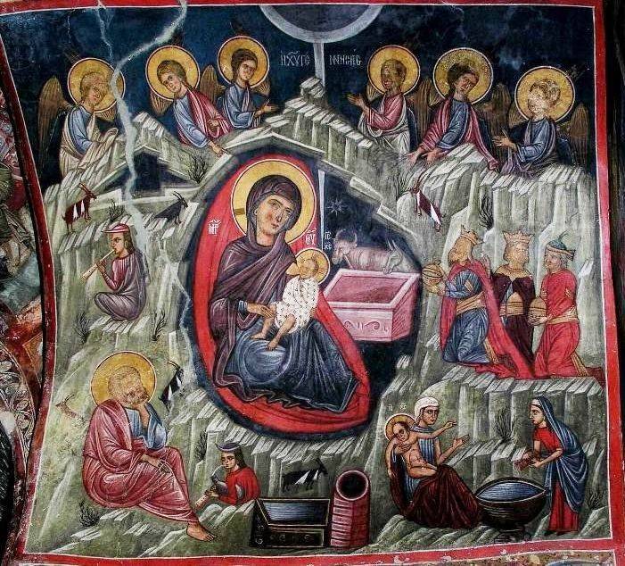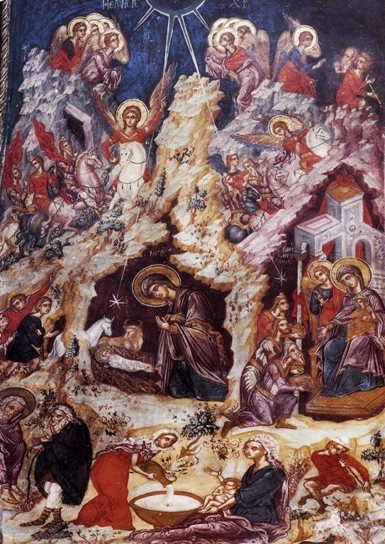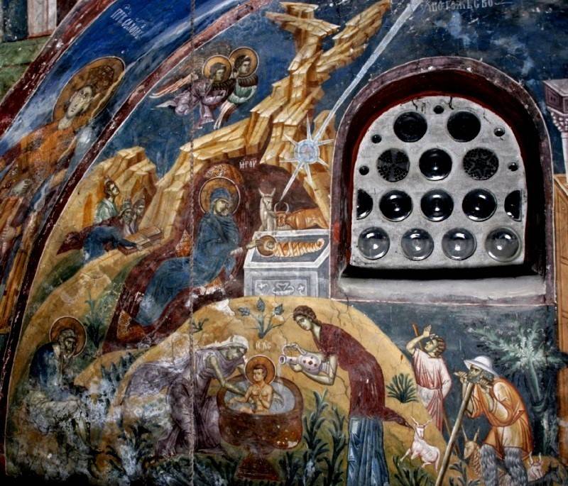 56. Сербия, Косово, собор Христа Пантократора монастыря Высокие Дечаны, роспись XIV в. Рождество Христово в цикле Акафиста Пресвятой Богородице (икос 4).