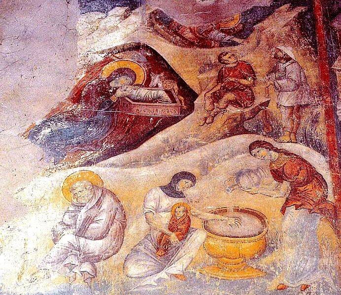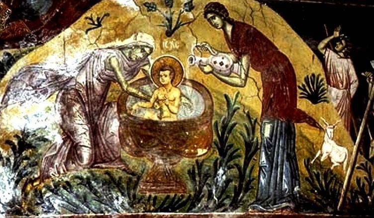 Казалось бы, совершенно естественная, житейская сцена. Однако считается, что Мария родила без боли и крови, т.е. Младенец родился совершенно чистым. И ни в канонических, ни в апокрифических Евангелиях об омовении Младенца после Рождества не говорится ни слова. Откуда же появилась эта сцена, со временем прочно вошедшая в иконографию Рождества Христова?