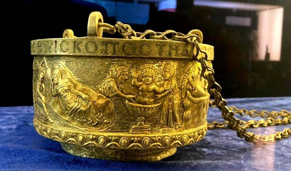 В нижнем левом углу традиционная сцена купания – купель с утраченной ножкой (потир) и кувшин (сосуд для теплоты) с водой здесь золотые – как потир и кувшин для теплоты в православных храмах.