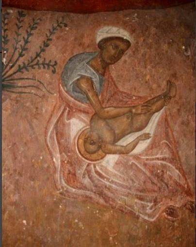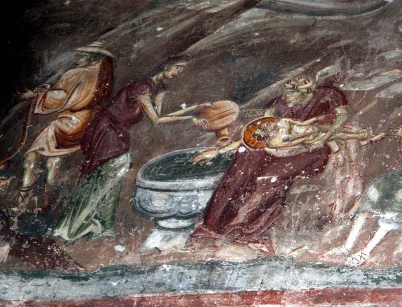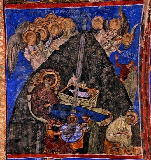 И под конец темы омовения Младенца Христа рассмотрим композицию, которая никого не может оставить равнодушным. Это фреска в храме св. Ахиллия в Арилье, Сербия, XIV в.