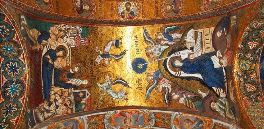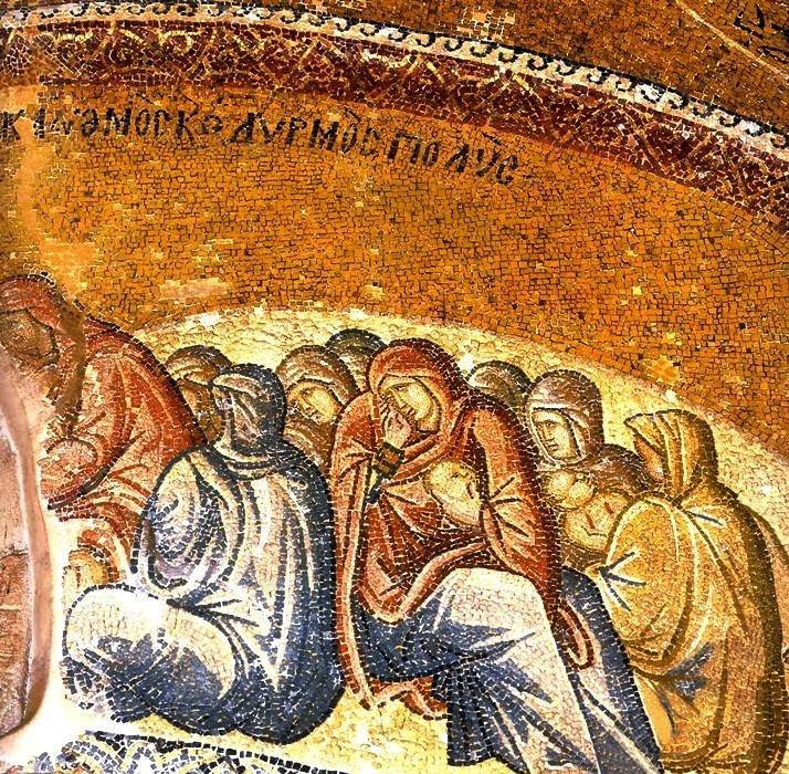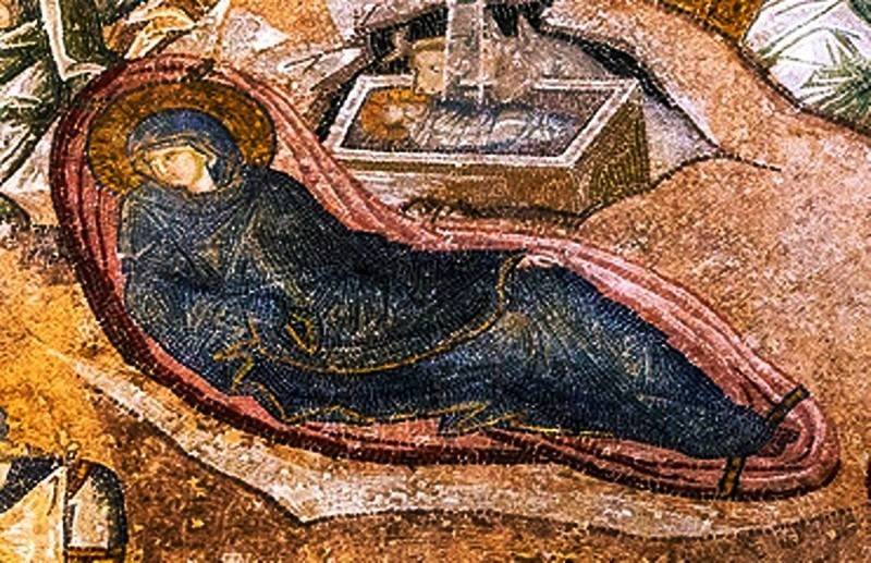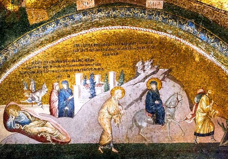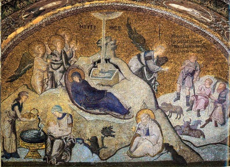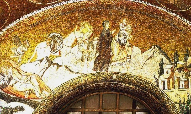 В монастыре Хора Зоон (монастырь Спаса «В полях» или «В круге жизни вечной») в Константинополе на стенах и сводах экзонартекса сохранился, пожалуй, самый полный мозаичный цикл XIV в., посвященный земной жизни Богородицы Марии, включающий также и цикл Рождественский. Выложу фотографии по порядку следования, без комментариев.