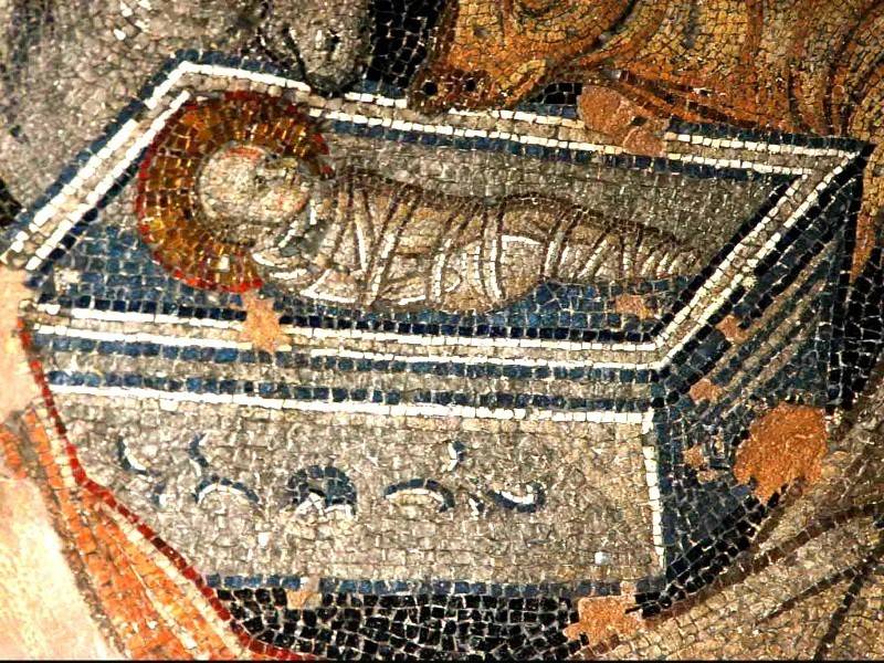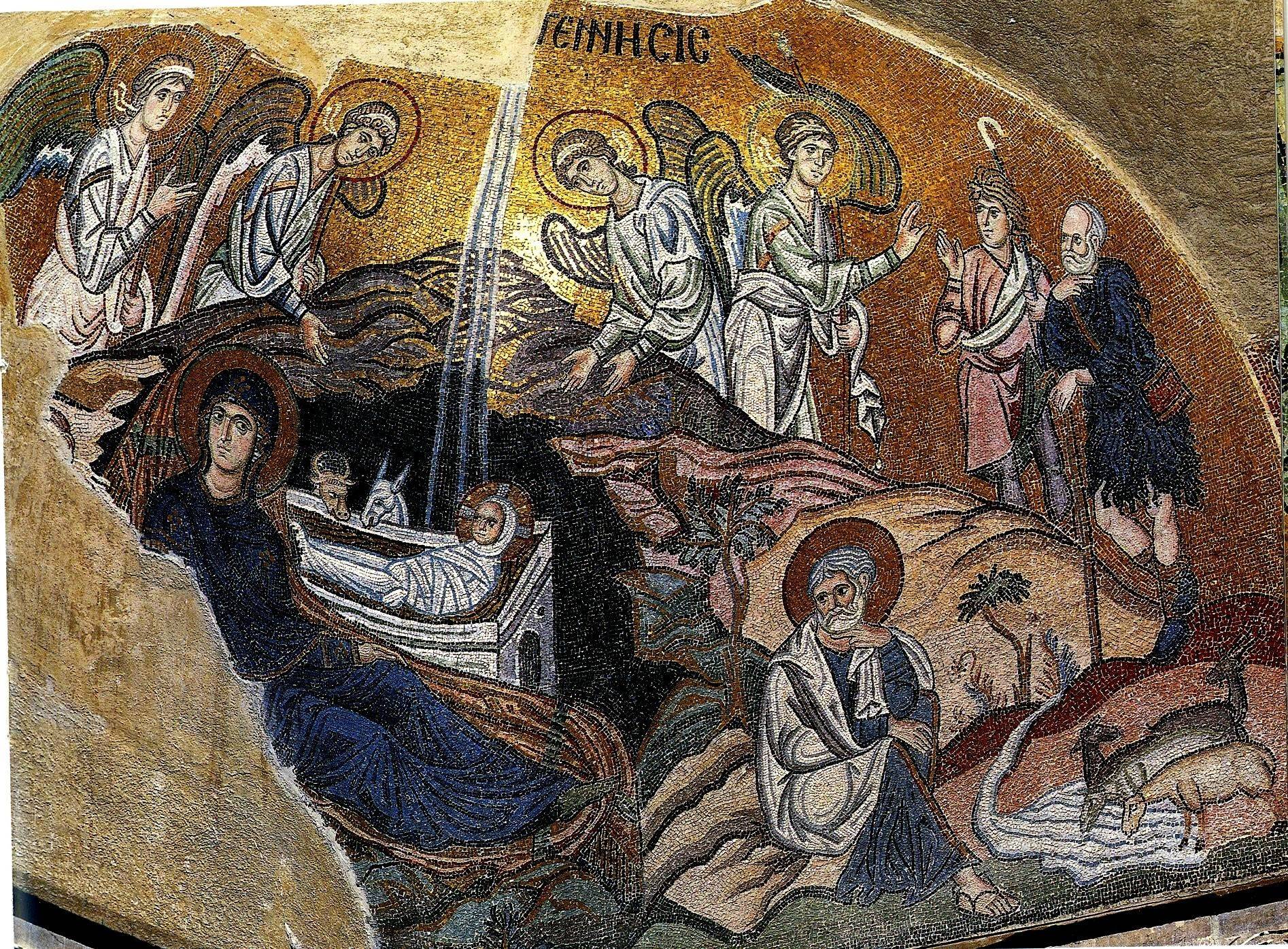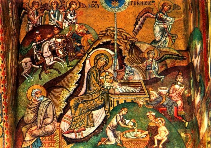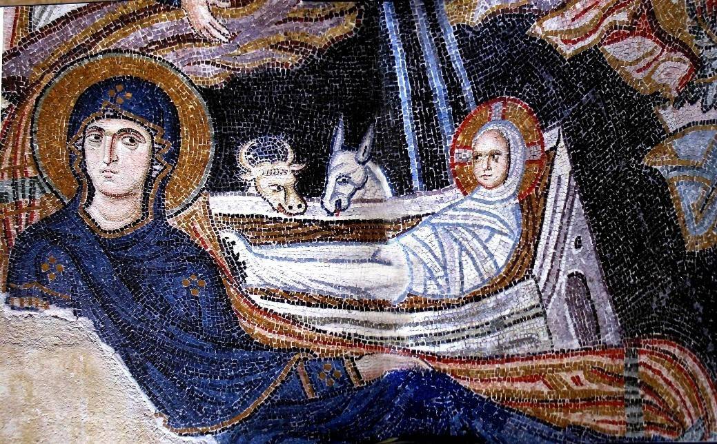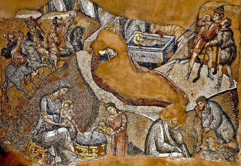 И закончим мы обзор раннехристианских икон Рождества самыми красивыми и грандиозными произведениями искусства в технике, известной еще с античных времен, но с победой христианства обретшей новое звучание. Это техника мозаики – искусство выкладывания живописных изображений из мелких камешков и кусочков стекла, которые не тускнеют от времени, но сохраняют свои первозданные цвета и блеск на протяжении веков и тысячелетий.