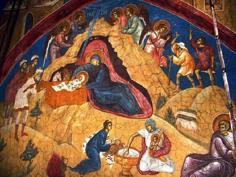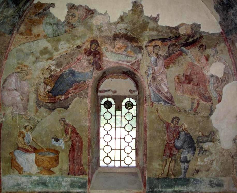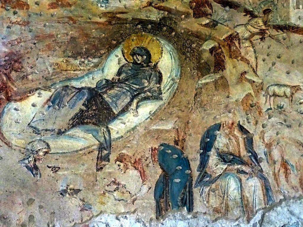 16. По счастливой случайности в апсиде каменного «сарая» сохранились фрески именно рождественского цикла. Все сцены пронизаны какой-то необычайной лиричностью, даже трепетностью. Кажется, все погружено в покой, и в то же время ощущается какое-то движение, некое веяние тихого теплого ветра (3 Цар. 19:8-12). На самом деле эта двойная подкладка – проступающее за изображенными на стене земными событиями сакральное действо – ощущается практически на каждой иконе Рождества. Но на этой – как-то особенно явственно. Здесь очень ощутимо звучит также торжественность, значимость события, которое повлияет на судьбы мира на много тысяч лет вперед, и таинственность, необычайность этой чудесной ночи.