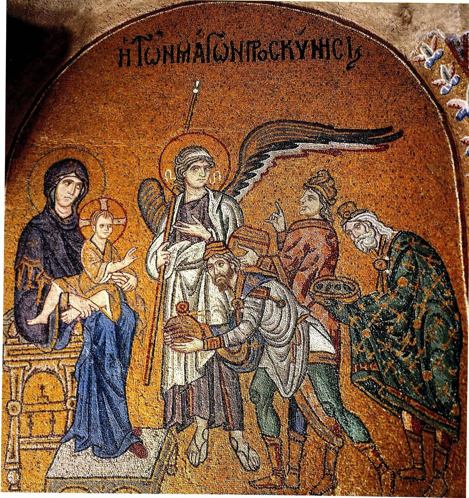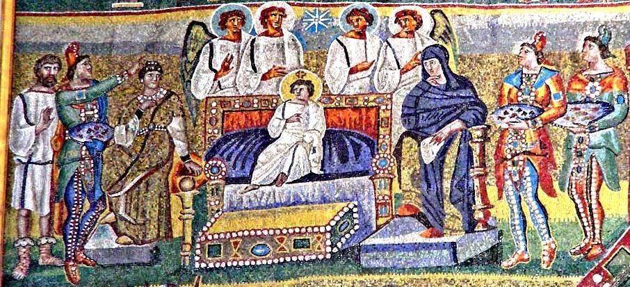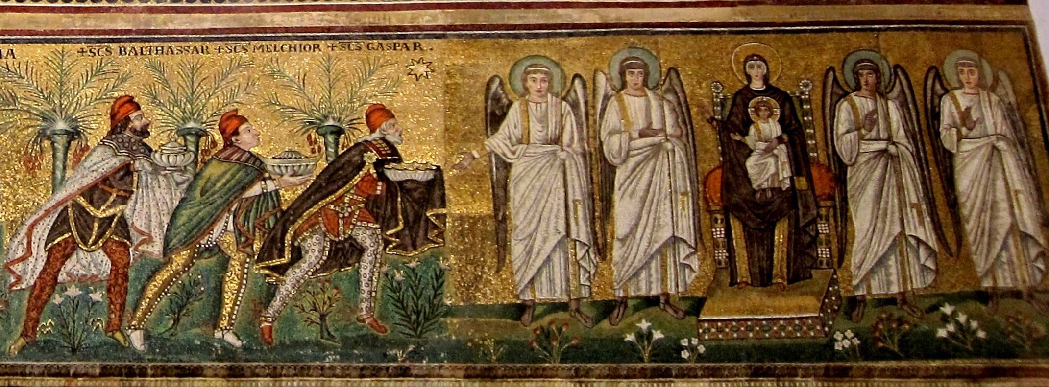 Тот факт, что фигуры волхвов оказались вставлены в уже готовую композицию (они заменили изображения поверженных арианских правителей Равенны; место стыка золотого фона видно невооруженным взглядом), вызвал неожиданный эффект: земное, хотя и сакральное, событие оказалось включено в обстановку Царства Небесного. Первоначально, как мы уже говорили, это была процессия мучеников с одной стороны и мучениц – с другой. Драгоценные венцы мученичества – образ испытанного в горниле страданий золота – несут святые свидетели своему Царю и Богу – Христу и Его Пречистой Матери. То есть, фактически эти люди приносят Им в дар свою земную жизнь, но и награду получают соответственную – жизнь вечную и Царство Божие. И понятно, что вся сцена происходит в райских обителях в вечности (обратим внимание на финиковые пальмы и белые лилии). Не только Христос на противоположной стене изображен здесь как Спас Вседержитель, но и Богородица представлена как Царица Небесная – на престоле и в окружении стражей – Архангелов четырех ветров – сторон света. В упор смотрит и приветствует нас не столько Новорожденный, сколько Предвечный Младенец – Спас Эммануил, восседающий на коленях Матери, как на троне. Такого типа иконы Богородицы с Младенцем позднее получат именование «Всецарица» или «Никопея».