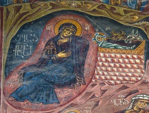 50. На замечательной композиции «Рождество Христово» начала XIII в. в храме халкедонитского (православного) монастыря Ахтала (Армения) поза и положение рук Марии напоминает икону Богородицы Скорбящей. Возможно, это не случайно – Она уже провидит будущую судьбу Своего новорожденного Сына.