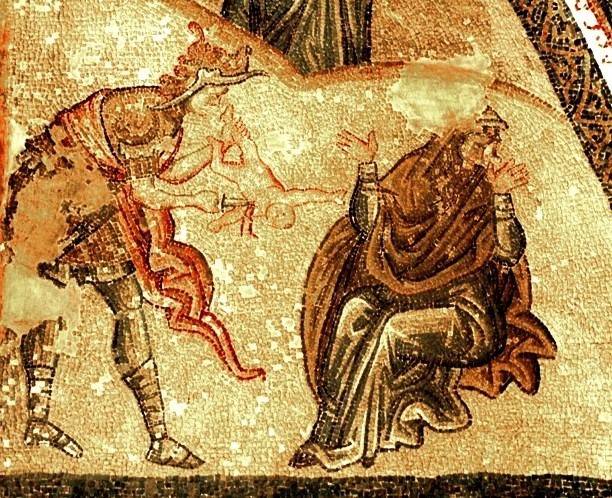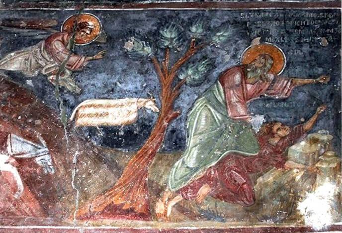Но пока Богомладенец, отъятый от Своей земной Матери, лежит на коленях у старухи, запрокинув голову и обнажив шею так, как будто ожидает удара жертвенного ножа (или евхаристического копия)! В такой позе – с запрокинутой головою – мы часто видим на стенах византийских храмов приносимого в жертву отцом своим отрока Исаака. Именно этот сюжет как земной прообраз Жертвоприношения Сына Отцом изображен в нартексе храма св. Ахиллия.