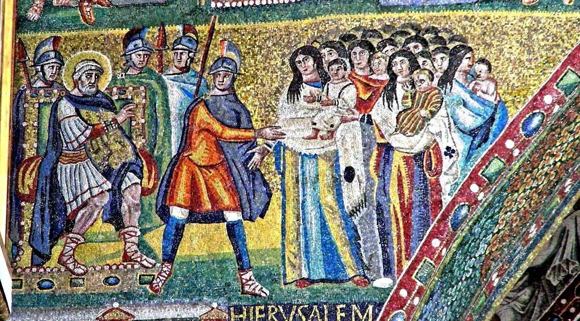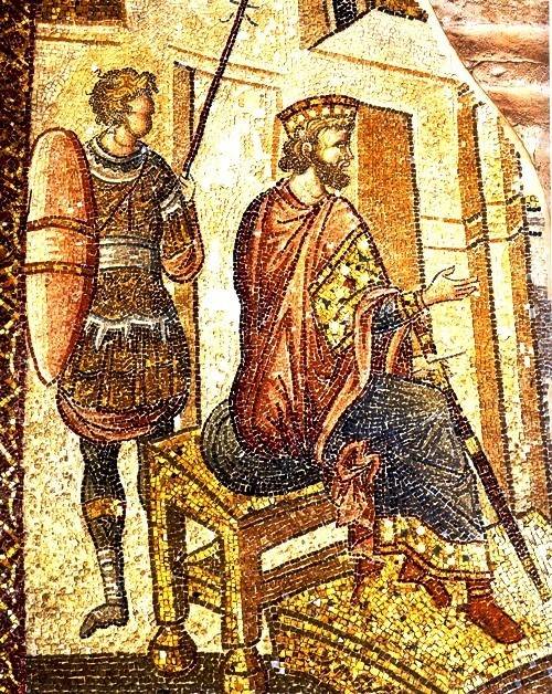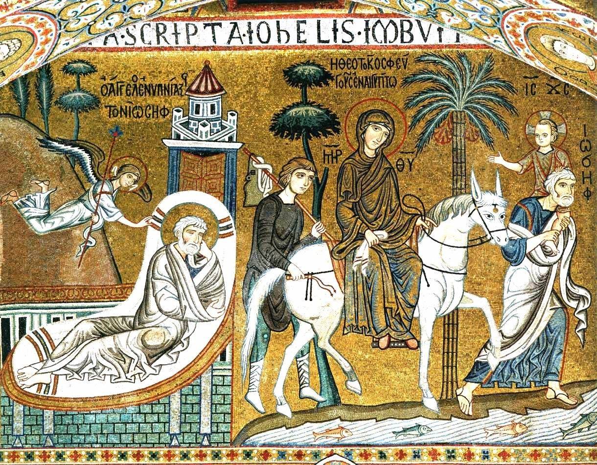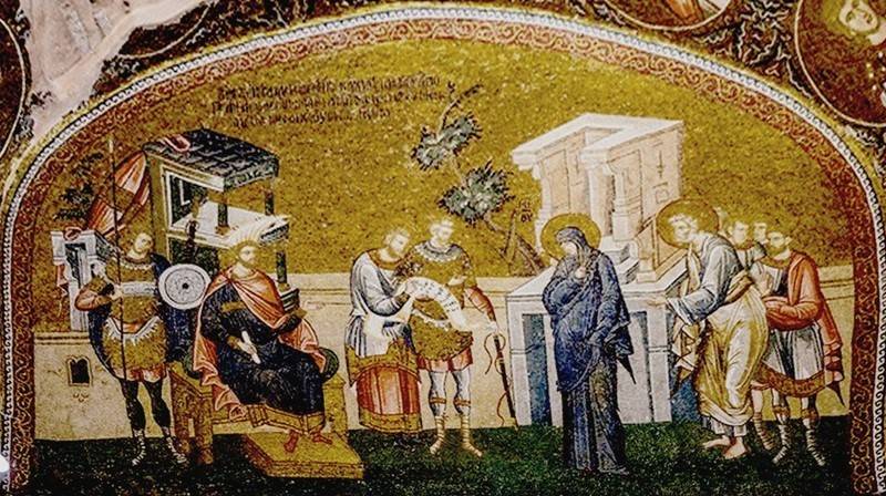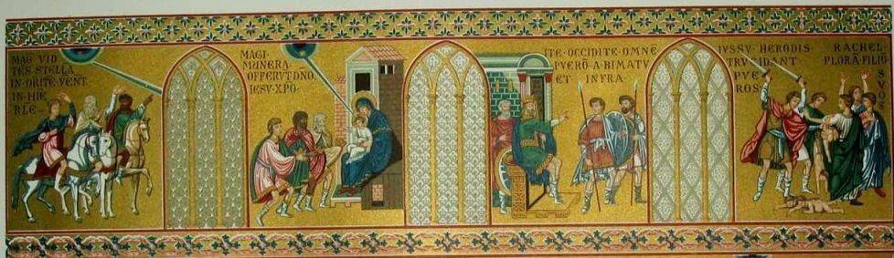 Обратим внимание: на всех композициях триумфальной арки нимбы присутствуют только у Младенца Христа, у Ангелов и… у Ирода. Это имеет свое объяснение: в те времена с нимбом изображались цари как носители данной от Бога особой благодати власти, харизмы (в Иране это понятие именовалось «хварна» или «фарн» – «божественный свет»). А высокий статус Богородицы в композициях Благовещения, Поклонения волхвов, Сретения и сцене в Египте подчеркнут золотым платьем и украшениями из жемчуга и драгоценных каменьев.