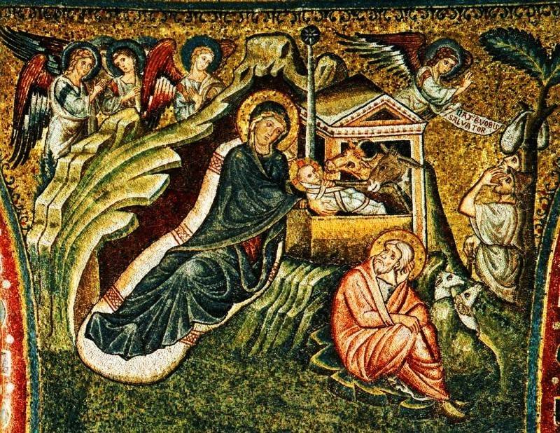 Ясли с Младенцем изображены на всех композициях Рождества Христова. Но, пожалуй, самым ярким примером в этом смысле является мозаика XII в. в апсиде храма Санта Мария Маджоре. Рассмотрим эту композицию.