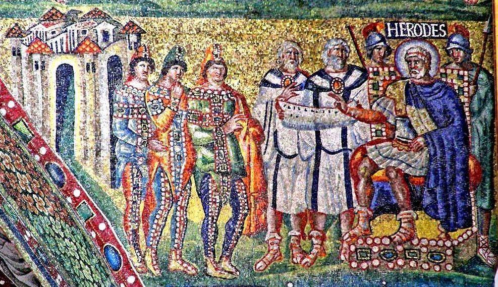 «И маги пошли, и вот звезда, которую они видели на Востоке, их вела, пока не вошла в пещеру. И маги увидели Младенца с Марией, Матерью Его, и поклонились Ему. И, вынув приношения из сумок своих, они поднесли Ему золото, ладан и мирру. И ангел известил их, что не надлежит им возвращаться к Ироду, и они другим путем отправились в страну свою».