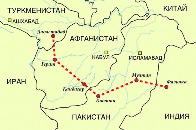 Это карта газопровода Туркмения - Афганистан - Пакистан - Индия, о котором очень мечтают все стороны. Но пока Афганистан трясло в различных конфликтах, проект был только в мечтах. Новое афганское правительство, если сможет уничтожить структуры ИГИЛ*, которые обитают как раз ближе к границе с Туркменией, тообеспечит безопасность стройки и эксплуатации на своей территории. А, как мы все знаем, за спиной ИГИЛ и Аль-Каиды* маячит тень американских спецслужб.