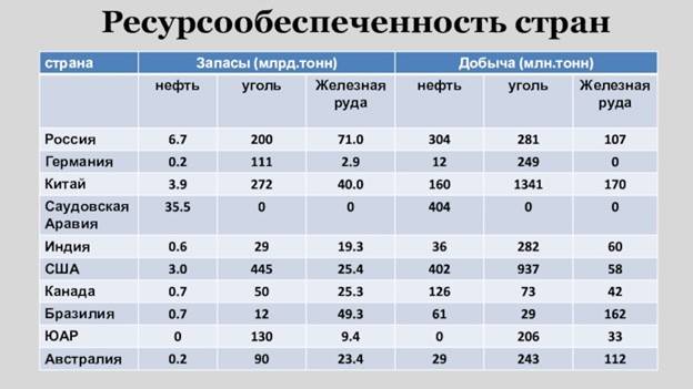 Россия же не является сверхдержавой, но является одним из лидеров по созданию военных технологий и технологий по применению мирного атома, и богата ресурсами. По всем видам ресурсов лучше всех в мире обеспечены США и Россия.