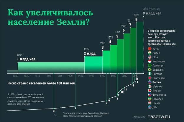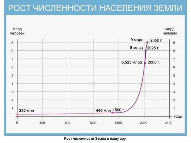 В начале ХХ века население было численностью почти 1,7 миллиарда населения. И несмотря на две мировые войны, которые унесли десятки миллионов человек, несмотря на эпидемии гриппа, холеры, тифа и т.п. гадости, несмотря на появление презервативов и других доступных средств контрацепции, население продолжило свой рост.