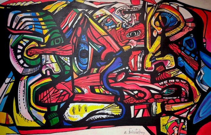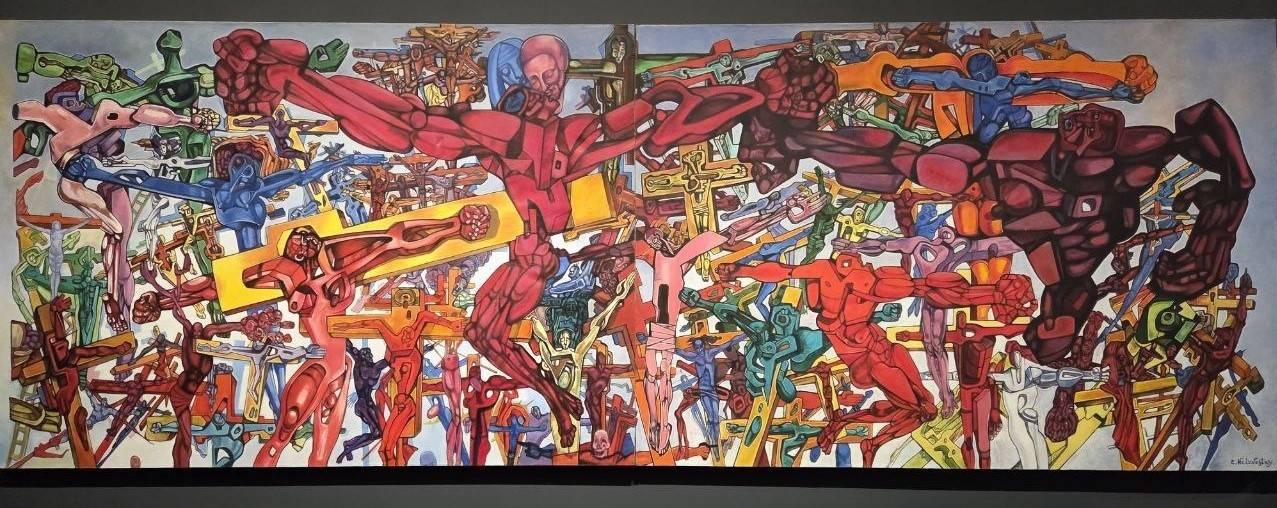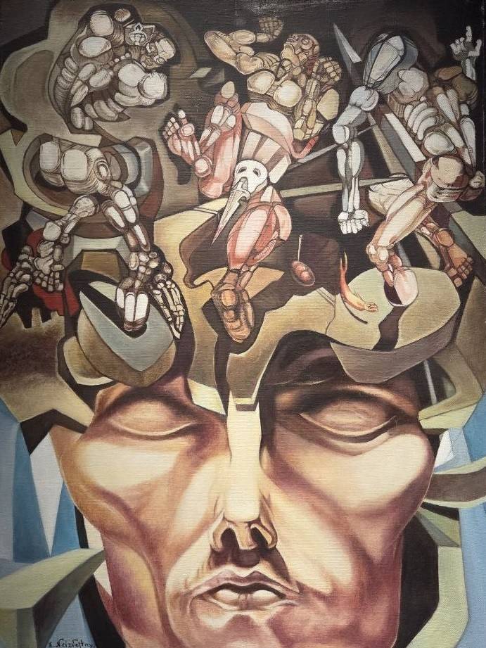 На рисунке из серии «Судьба художника» - скорчившийся мужчина, которого ничто не держит в такой жуткой позе, но он не в состоянии развернуться. Неслучайно и обращение к «Божественной комедии» Данте Алигьери – идеально выражена преисподняя, где всё обречено к раздроблению и давлению. На полотне «Сад душ» - бесконечные голгофы, и акриловая яркость лишь добавляет ужаса этой картине. «Смятение» - это перепутье и незнание, куда идти. Крепкая ручища указывает в одну сторону, а цель – она, возможно, в другом месте. «Проходящий сквозь стену» - что это, как не попытка эскапизма? Уничтожить преграду оказывается легче, нежели с чем-то смириться – он не похож на «проходящего», мы видим одолевающего. «Бегун в ленте Мёбиуса» - неужели своеобразный автопортрет, где человечек мается внутри злой бесконечности? На ряде тщательно проработанных рисунков (без названия) явлена голова с гигантской трещиной, а из глаз вытекает кровища. Целостен лишь Фёдор Достоевский – его портрет напоминает идола, стойкого и бескомпромиссного.