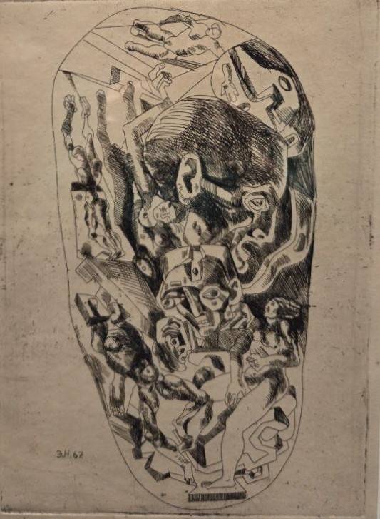Многие работы Неизвестного – это попытка вырваться из тенет, причём тенета – это не столько советская действительность, как часто пытаются вообразить, сколько – рефлексия и поиск целого, изначального, неделимого. Композиция «Два лица» - ощущение личной двойственности, где сознание борется с подсознанием и, как справедливо отметил Никита Хрущёв, идёт битва ангела с демоном. На одном из рисунков – некто, чью голову раскалывает крест. «Ядерный взрыв» - снова разрывание на части и безмолвное рыдание, кое никто не услышит. Многоликость-раздвоенность возникает в работе «Пантеизм», где автор обращается к языческой праистории, когда боги бывали капризны и поворачивались то ясным ликом, то – злобным, как стихийное бедствие. «Тотем» - ещё одна вещь, погружающая в запредельную архаику. Не вполне ясно, что за животное выступило в тотемическом качестве, ибо предъявлен череп с пустыми глазницами.