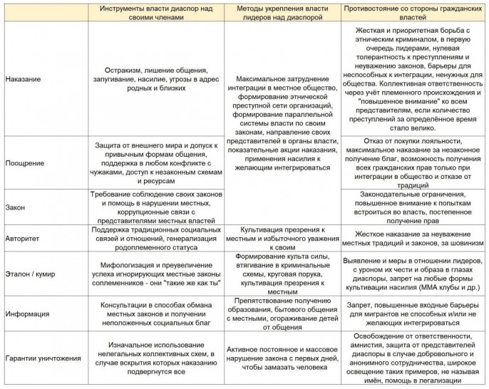 Сын за отца не в ответе, но наличие близких родственников рецидивистов или постоянно живущих за рубежом сильно ограничивает карьеру индивида. Данные правила определены для нашего общества, ушедшего от родоплеменных отношений, мы стали судить о людях по их собственным поступкам, а не семи поколений родни. Однако, к нам едут индивиды, для которых «свой» в конфликте с чужими всегда прав, какой бы тварью и преступником он ни был, чего бы ни творил. Эти люди создают диаспоры, проталкивают везде своих, манипулируют нашими законами (см. Рисунок). Они требуют прав, но отказываются от обязанностей, ссылаясь на традиции, с этим нужно бороться. Если для них семиюродный родственник считается близким, это необходимо учитывать.