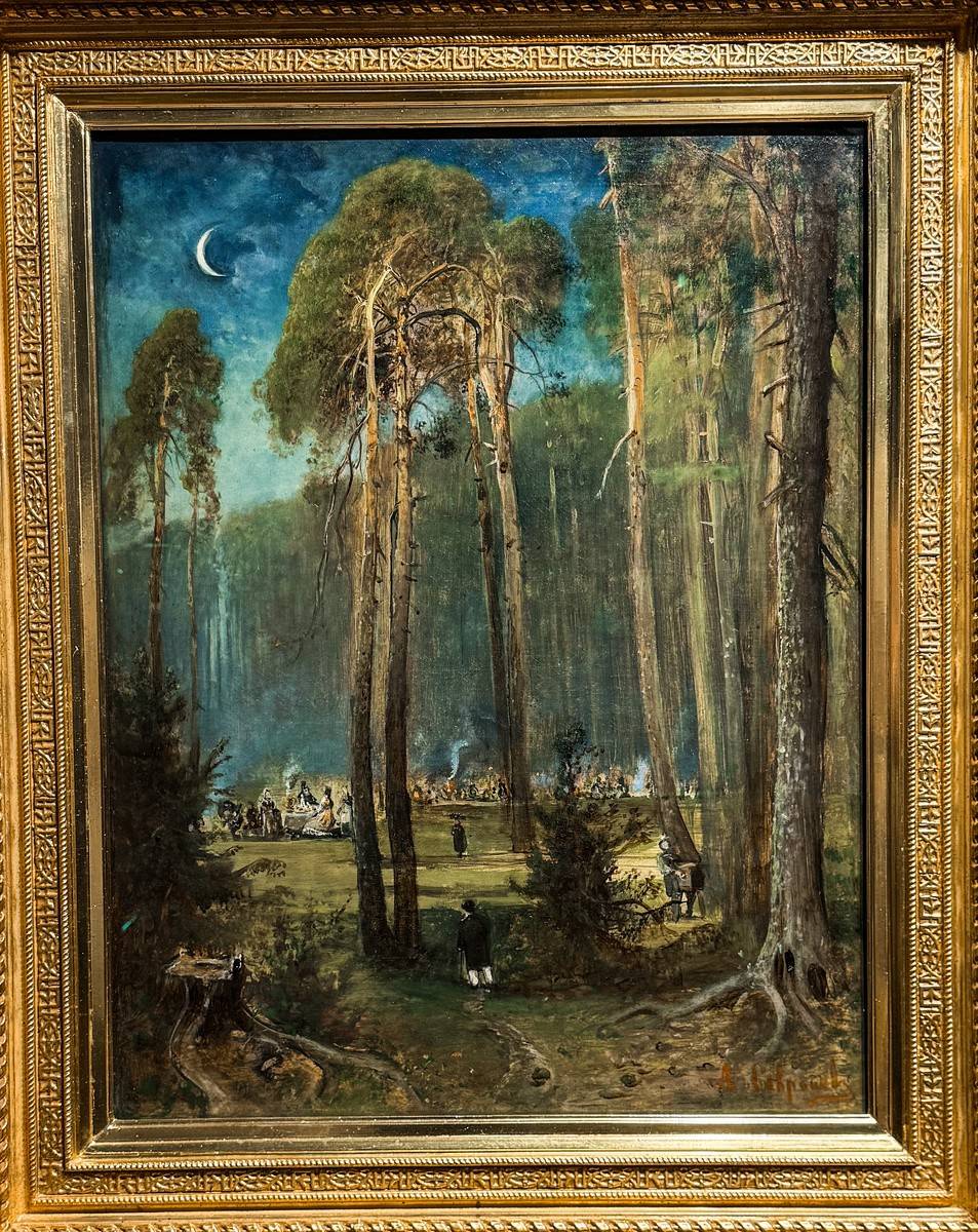 Саврасов представлен картиной «Пикник», а то была остромодная тема 1870-1890-х годов – чуть не каждый европейский мастер, особливо в Парижах, спешил запечатлеть вылазку молодёжи в сельскую, лесную местность. Урбанизация, рост промышленности, дымы и гулы – это делало городское бытие малоприятным, оттого-то стали популярными пикники с прогулками и флиртом. Саврасов смещает акцент на деревья, небо и серпик луны, а люди поданы схематично – они в глубине композиции.