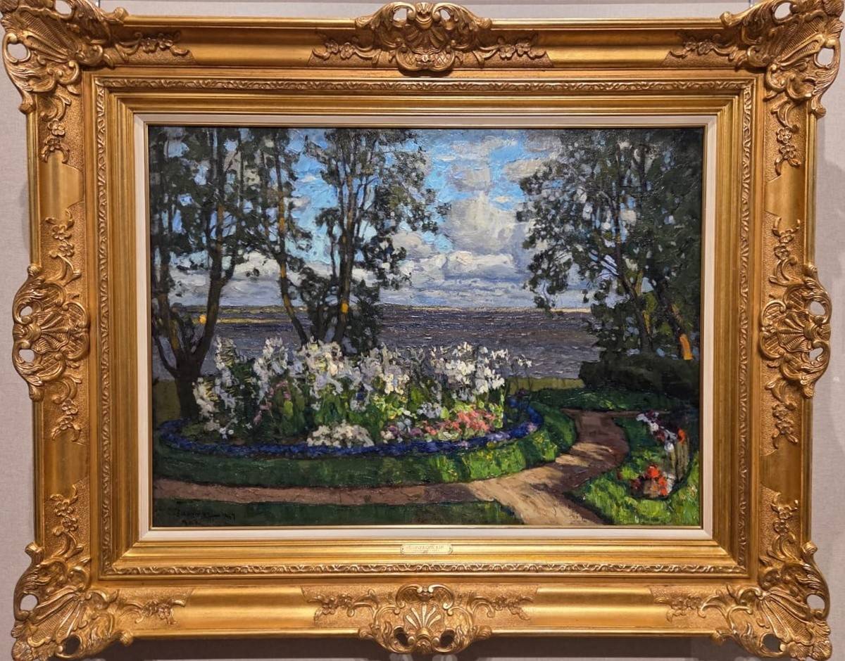 Уже афиша даёт нам понять, что основное внимание будет обращено к Константину Коровину и его дивным соцветьям и созвучьям. Он видел мир интенсивным, сочным, густым. «Бревна от земли шли в жёлтых, оранжевых рефлексах. Цвета горели невероятной силой, почти белые. Под крышей, в крыльце, были тени красноватые с ультрамарином. И зелёные травы на земле горели так, что не знал, чем их взять», - писал он в своих мемуарах.