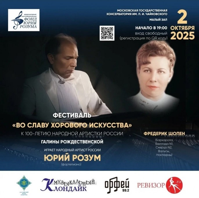 Музыка Шопена в исполнении народного артиста России Юрия Розума прозвучит 2 октября в Малом зале Консерватории. Сольный концерт маэстро – часть фестиваля «Во славу хорового искусства» который посвящен столетию народной артистки России Галины Рождественской. Дирижера Хора русской песни Гостелерадио СССР, профессора кафедры дирижирования РАМ им. Гнесиных и матери пианиста Юрия Розума. Выбор программы не случаен: Фредерик Шопен, «фортепианный ангел», как звали его современники, был её любимым композитором.