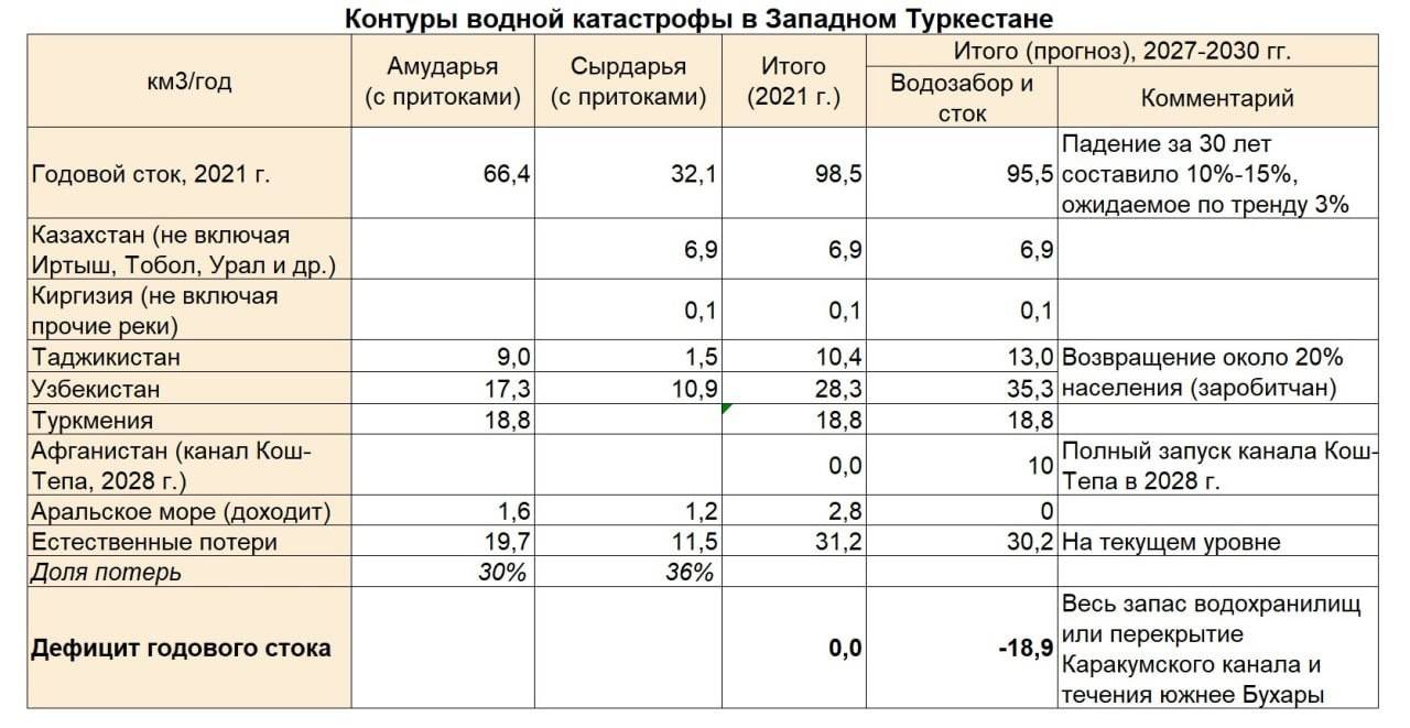Согласно имеющимся трендам, в 2027-2030 гг. можно ждать полноценной региональной водной катастрофы, которая затронет весь Западный Туркестан. Годовые колебания имеют место, но общий тренд негативный, потоки забираются практически полностью, «удачный год» может отсрочить и смягчить проблемы, но не более. На фоне мировой катастрофы, распада глобального мира, геополитических ошибок ждать помощи не от кого, наоборот, будет только хуже: