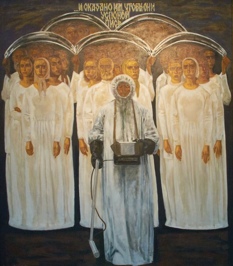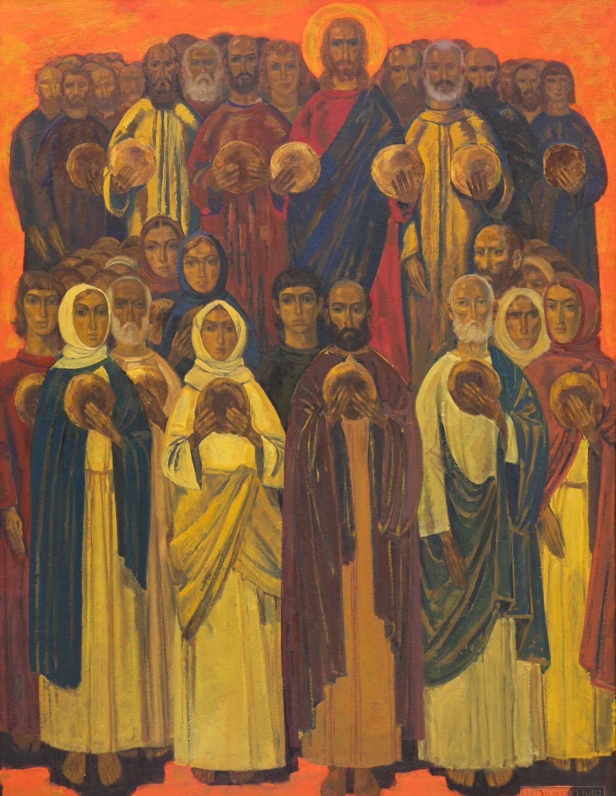 В 1990-х он пишет иконы – тому пример Богородица, представленная в экспозиции. Это уже не аллегория, не партизанская или чернобыльская мадонна, а канонический образ. Прекрасна вещь «Чудо о хлебах» - когда Иисус накормил целую толпу. Вместе с тем, большая часть работ 1990-х смотрится куда как слабее, нежели те, что были созданы в безбожном СССР. «Куст роз» - прелюбопытная задумка, связанная с идеей сада, но исполнение скучное и технически хилое – всё наляпано и набросано, а розы выглядят, как малопонятные комья и никак не цветы. Собственно, отыскать творца, для которого 1990-е годы стали бы эрой воспарения – сложно.
