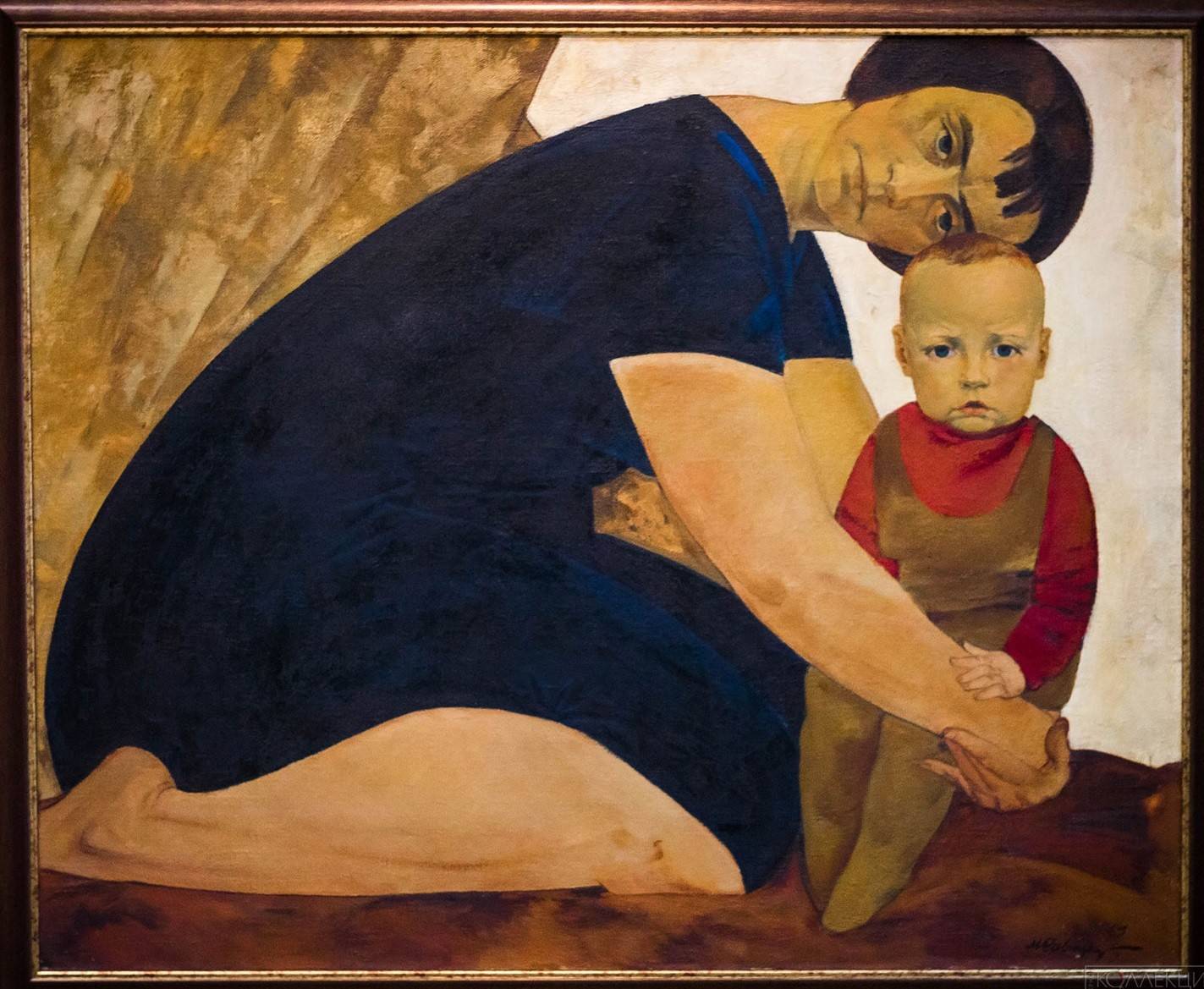 Потрясающая вещь «Рита и Андрей» - художник изобразил свою супругу Маргариту Захаровну и единственного сына. Крупное тело женщины словно бы «обволакивает» ребёнка, защищая его от всех напастей. Материнство для Савицкого было напрямую связано с мадоннами - он воспринимал женское начало, как созидающее и творящее. На картине «Семья» - все трое, но разобщены и каждый сам по себе. Концепция «сурового» стиля – писать людей, погружённых в свои думы. Адептов этого направления иногда поругивали за воспевание индивидуализма, но мыслительный процесс – это всегда что-то личное.