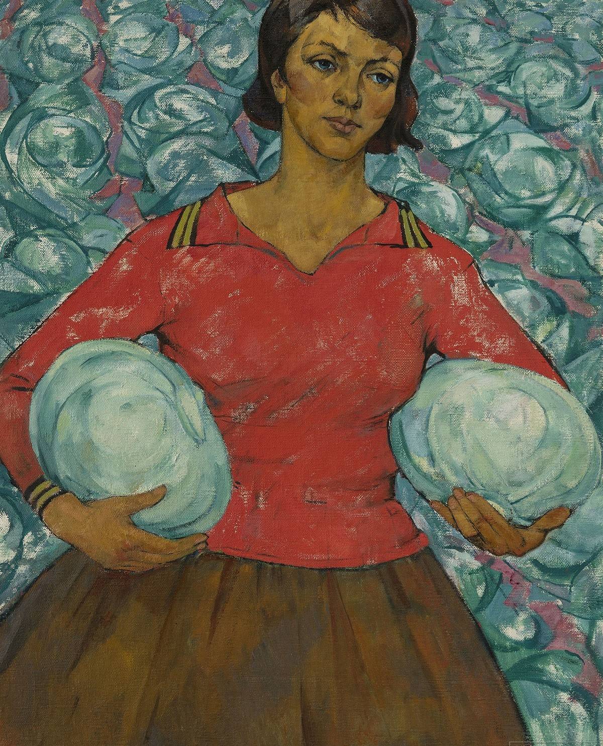 Стиль поименовали «суровым», хотя, картины могли быть и солнечно-яркими. На выставке – целый ряд полотен 1950-х – 1960-х годов. «На ярмарке», «С сенокоса», «Девушка с капустой» - повсюду радостные краски и колористическое буйство. Оранжевый, красный, жёлтый, зелёный – всё сливается в едином ритме. А вот «Хлебы» - действительно жёстко-шероховатая натура – крестьянки с грубыми лицами несут караваи. Всё лапидарно и строго, а коричневая гамма подчёркивает общий настрой.