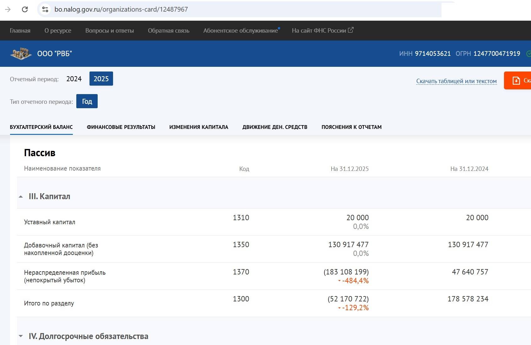 Теперь попробуем разобраться с отчётностью «Вайлдберриз». Подобное было сделано ранее в заметке «Озон» и «Почта России»: что позволено Юпитеру и не позволено быку» в марте 2026 года, с выводами про «убытки, лазейки в налогах и банковском регулировании «Озона». «Вайлдберриз» не публикует подробную отчётность, и она доступна только на сайте ФНС; к тому же операции были переведены в 2024 году на новое юрлицо — ООО «РВБ».