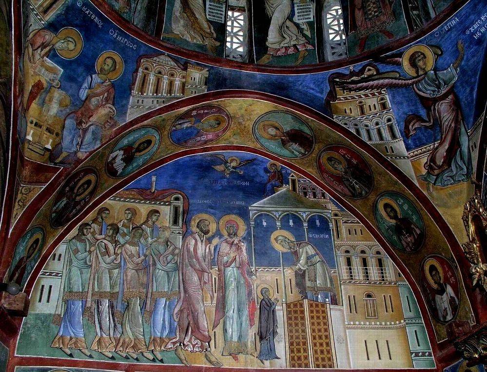 3. Фреска «Введение Богородицы во Храм» в соборе Св. Софии в Охриде (Македония, 1056 г., в это время епархия входила в состав Империи Ромеев) – одна из немногих сохранившихся сюжетных композиций, причем размещена она в малой апсиде – жертвеннике, где приуготовляются Св. Дары для приношения в алтаре. Уникальная богословская программа росписей храма составлена по плану святителя Льва Охридского; размещение сцен из земной жизни Богородицы в жертвеннике, возможно, по его почину, в дальнейшем вошло в традицию.