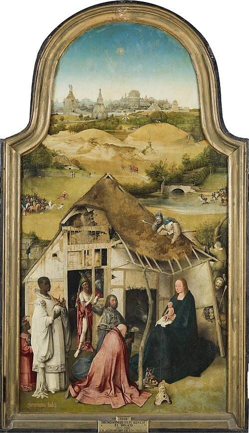 Весьма интересно то, что в живописи XV – начала XVI века (триптих написан в 1510) вновь появляется мотив противопоставления волхвов местному населению. Это тоже очень важный символ: местные жители, олицетворяющие иудеев, отвергли Христа, в том время как «маги с Востока» признали в Богомладенце истинного Мессию. Волхвы, т.о., символизируют внеиудейские пути ко Христу: это могут быть и монотеисты, и те, кто был некогда чародеями. (Об этом на триптихе Босха нам намекают изображения идолов на одеянии темнокожего волхва).