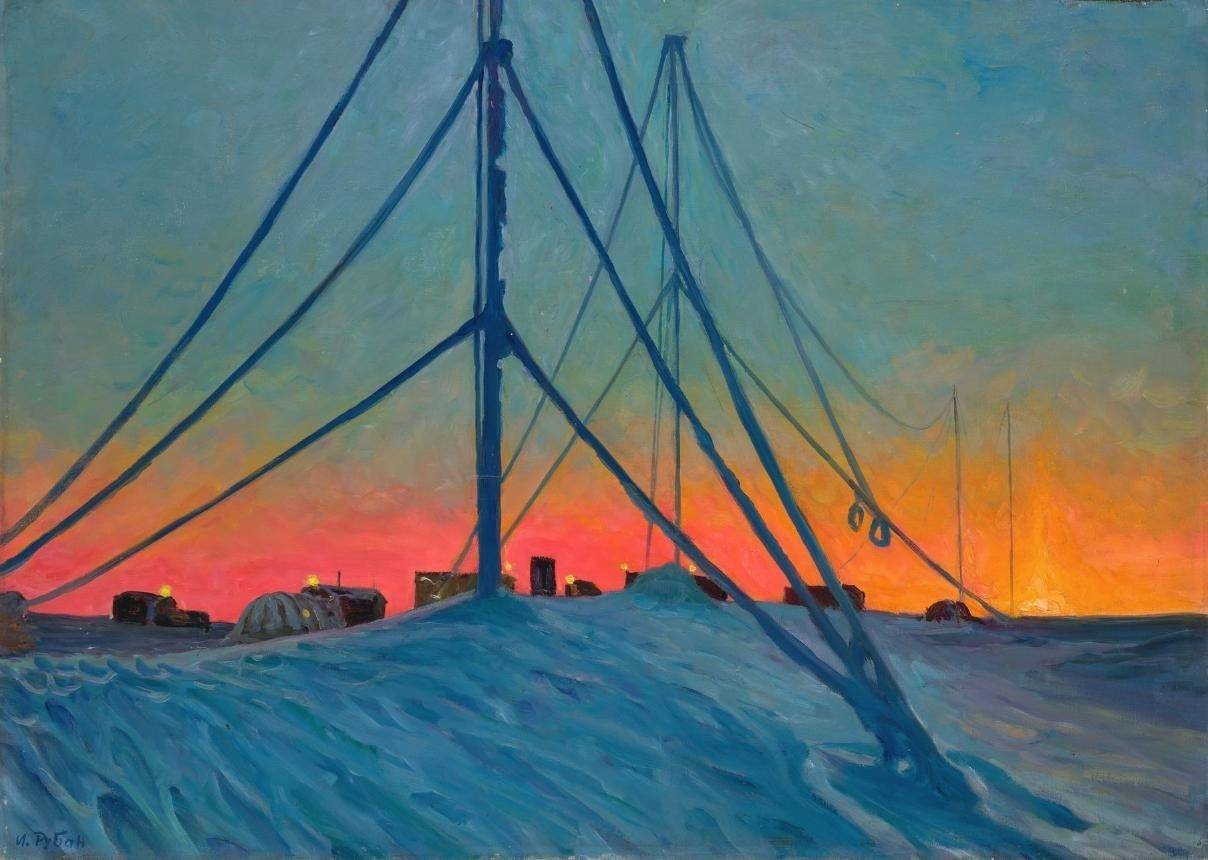 Что касается художника Виктора Рубана, то он, разумеется, не был туристом. Рубан с 1940-х годов участвовал в опасных экспедициях и ледокольных маршрутах, входил в состав зимовщиков на дрейфующих станциях, испытав на себе сложный быт полярников. Он рисовал и писал ежедневно. Волновало всё – погода и природа, животные, воды, ледоколы, ярчайшее солнце, когда оно являлось после многомесячной полумглы. Следом началась Антарктическая сага – и снова белые пространства и страсть к постижению.