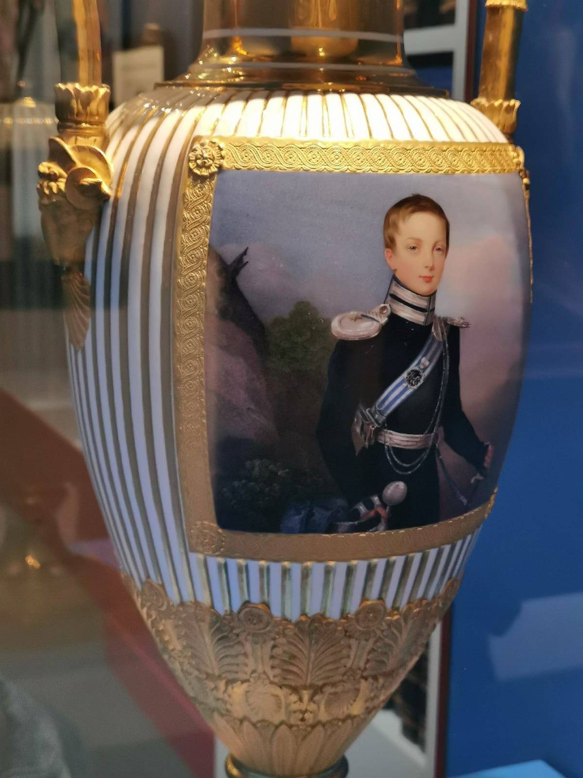 Особое место отведено личным вещам – перчаткам, шкатулочкам, записным книжкам. Несколько витрин заполнены посудой. Государь предпочитал изделия Императорского фарфорового завода – одного из старейших производств в Европе. Созданный по капризу Елизаветы Петровны в середине XVIII века, наш завод ничуть не уступал Мейсену и Севру, а иной раз, опережал их. Здесь же – стекло и хрусталь из царской резиденции Александрия, названной так в честь Александры Фёдоровны. Равнодушная к придворно-светской суете, государыня всё чаще гостила в Александрии, там же позируя художникам средь неоготических меблировок.