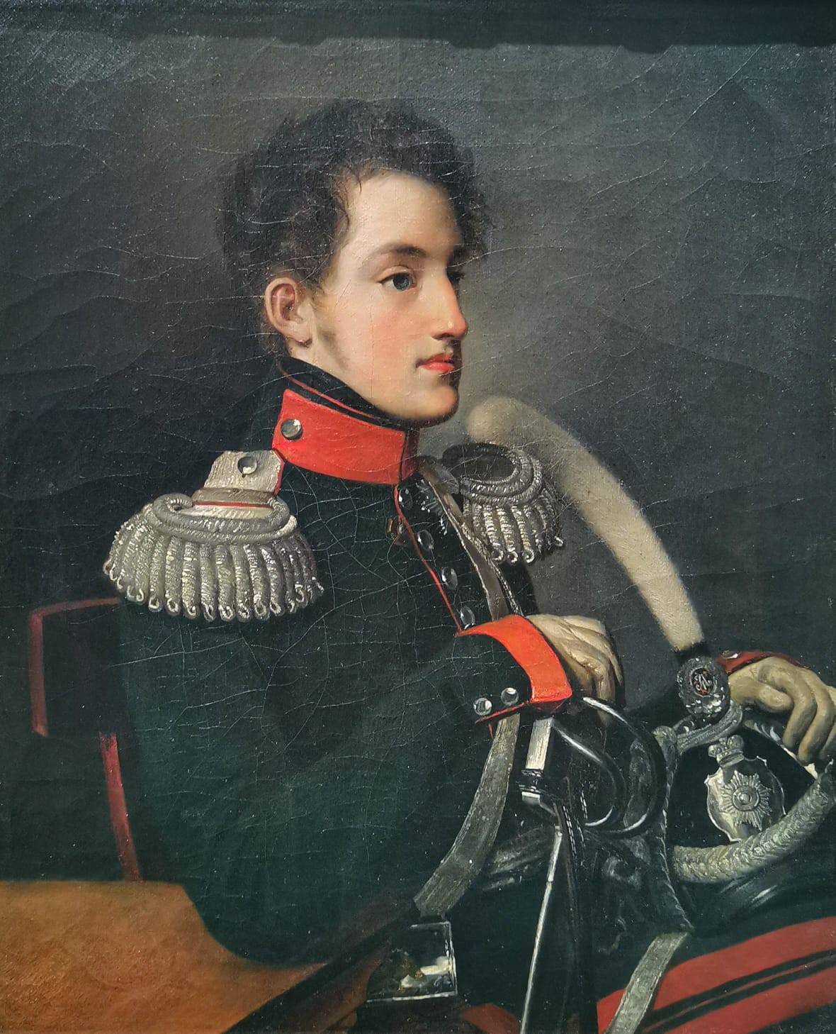 Нас встречают портреты его родителей – неказистого, курносого, но при этом - благородного Павла I и цветущей пышки Марии Фёдоровны. Отца своего Николай почти не знал – тот мало занимался младшими сыновьями, да и на момент страшного цареубийства, произошедшего в Михайловском замке, Николаю было пять лет. Зато маменька оказала серьёзное влияние на своего любимчика Николашу. На одной из выставочных витрин – письмо к матери, где он просит прощения за ненадлежащие поступки. Малыш был егозой и хулиганом, но обладал цепким умом и несгибаемой волей. Вот – ученические тетради, в том числе по истории. Удивителен стройный почерк мальчика – в те годы каллиграфические буквицы весьма ценились, но не все их достигали. Такая манера писать – знак уверенности и аккуратности. Тут же – чертежи и рисунки Николая. Он имел недурные способности к художеству, но не стал их развивать. Забавен автопортрет в профиль – царевич явно относился к себе с юмором. Динамична «Дама на лошади» - движение передано с невероятной точностью. Этот рисунок Николай сделал в Англии во время своего путешествия. К слову, тогда все дружно решили, что русский царевич – самый красивый принц Европы. Изображения 1810-х годов являют милого юношу, более напоминающего поэта-романтика, чем не технаря-военного. На одном из портретов, сделанном Орестом Кипренским, мы видим застенчивого молодого человека, ещё не знающего своей судьбы.