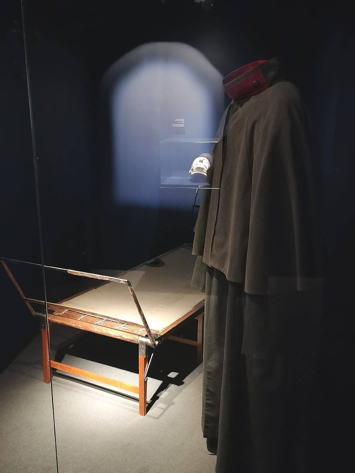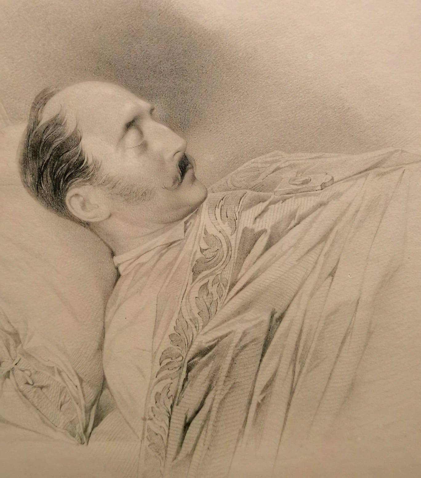Николай окончательно слёг, и всемерная помощь докторов не привела к выздоровлению. Есть версия, что монарх по факту совершил самоубийство – его добил проигрыш в Крымской войне, когда против России сражался весь коллективный Запад. Дескать, я хочу простудиться – и умереть. Скончался он на своей походной кровати, которую мы видим в экспозиционной нише. Рядом – его шинель. Та, которую он не захотел надеть. Печально-траурная подсветка, рисунок Владимира Гау «Николай I на смертном одре» и посмертная маска.
