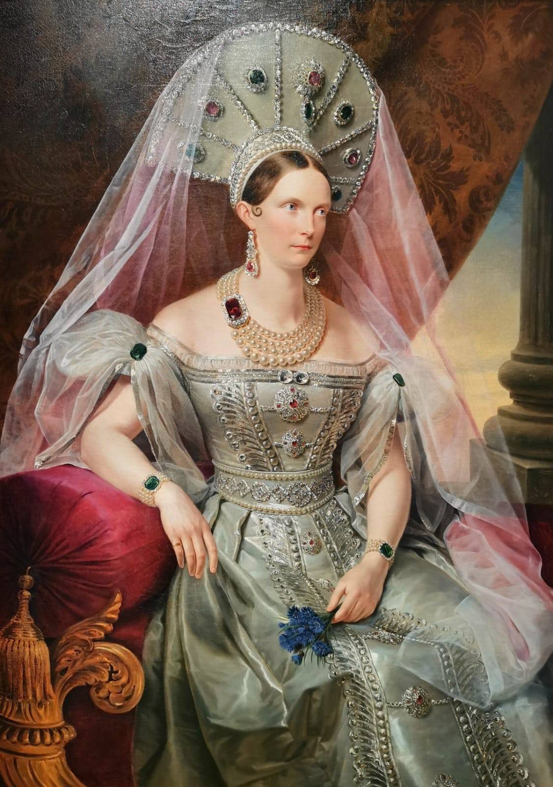 Целый раздел посвящён семейным ценностям Николая. Он был женат на принцессе Шарлотте Прусской, дочери легендарной королевы Луизы. Брак состоялся по любви, что немалая редкость в монаршей среде. После крещения в православную веру Шарлотта стала зваться Александрой Фёдоровной. Вот – парадный портрет императрицы. Она в церемониальном русском платье, сочетавшем боярские мотивы с элементами парижской моды. К облачению полагался кокошник с фатой. Выглядит эффектно - изящный контур, пышные рукава, бесценные вышивки.