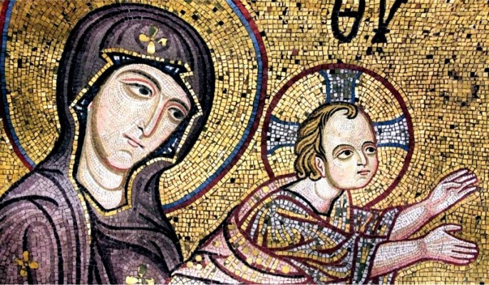 Мозаичная композиция "Сретение" выглядит для нас необычно. Здесь ещё не определён канон иконографии.