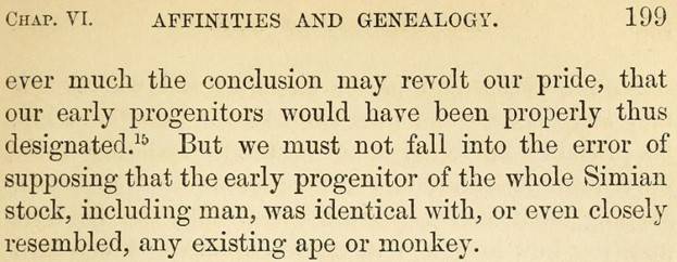 Русский перевод по второму изданию 1874 г. (перевод под редакцией И. М. Сеченова): «А так как человек с генеалогической точки зрения принадлежит к узконосым обезьянам Старого Света, то мы должны заключить, сколько бы ни восставала наша гордость против подобного выводА, что наши древние родоначальники были бы по всей справедливости отнесены к этой группе. Мы не должны, однако, впасть в ошибку, предполагая, что древний родоначальник всей группы обезьян, не исключая и человека, был тождествен или даже только близко сходен с какой-либо из существующих ныне обезьян» [8, с. 265].