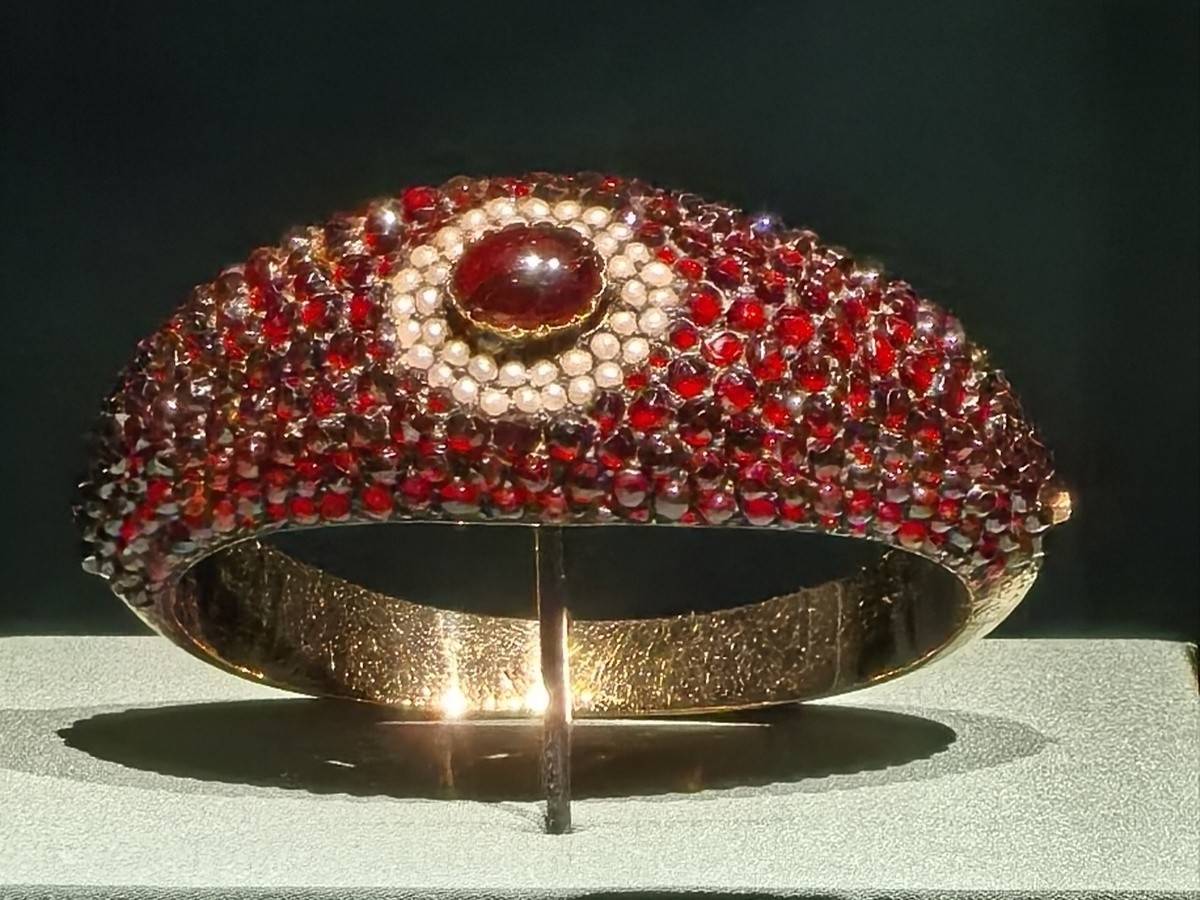 Вот – экспозиционная витрина с изделиями из граната. Здесь и серьги, и броши, и, разумеется, браслеты. Гранат напоминает капельки крови, и вместе с тем, горение страсти, как в знаменитой повести Александра Куприна. Любовь смешана с погибелью, а сияние с хладной мглой. «Он был золотой, низкопробный, очень толстый, но дутый и с наружной стороны весь сплошь покрытый небольшими старинными, плохо отшлифованными гранатами. Но зато посредине браслета возвышались, окружая какойто странный маленький зеленый камешек, пять прекрасных гранатовкабошонов, каждый величиной с горошину», - так рисует автор отчаянно-печальный дар нищего чиновника. Экспонаты дают возможность узреть чудо граната – он и образец витальности, и демонический камень. Впрочем, он умеет быть «кокетливым», если ловко вплетён в златые виньетки.