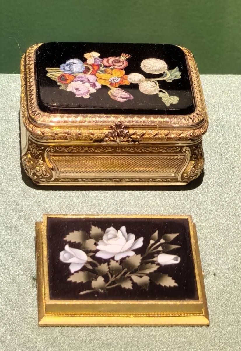 Представлены табакерки, оформленные микромозаикой. Это было необычное искусство, примыкавшее к ювелирному мастерству, а иногда считавшееся одним из его направлений. Картинка, весьма сложная и причудливая, формировалась из мелких кусочков смальты. Родина микромозаики – Ватикан, а в России она получила распространение в XIX веке. Посетив Ватикан, император Николай I оказался под таким впечатлением от увиденных диковин, что повелел открыть в Петербурге мастерскую, куда приглашали итальянских мозаичистов. Затем появились и русские умельцы.